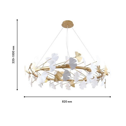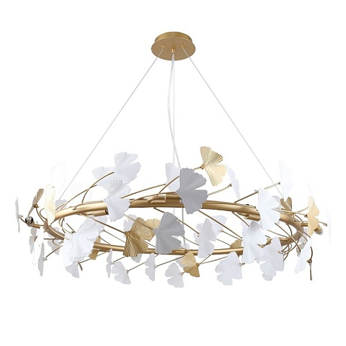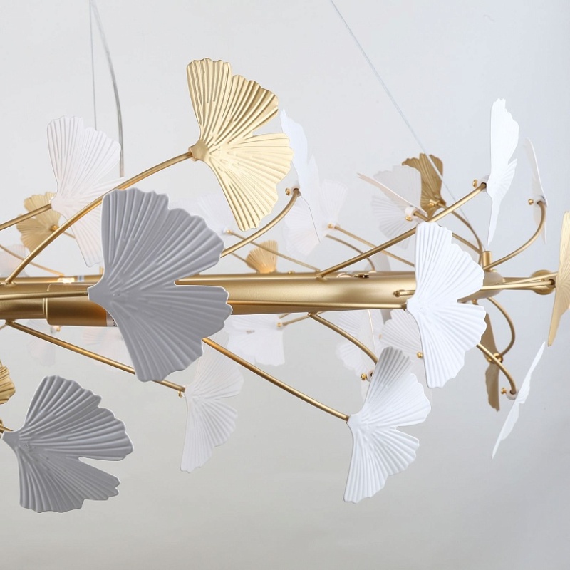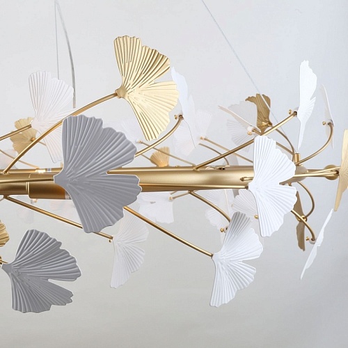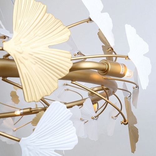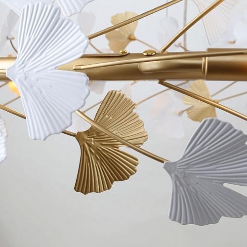 Металлический каркас цвета окрашенное золото, декор в виде листьев Гинкоа в белом и золотом цвете, сменные лампы.