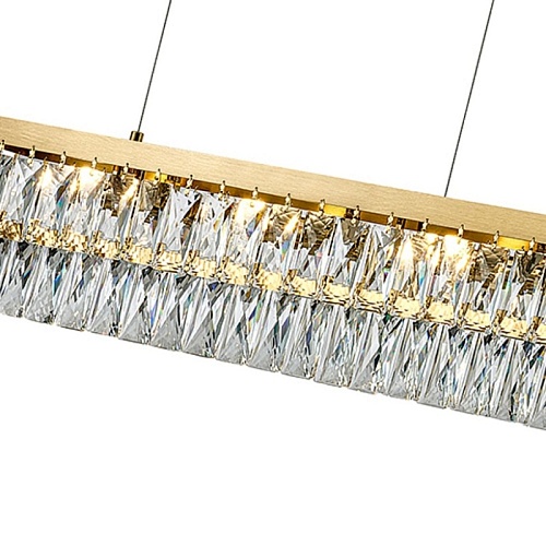 Прямоугольный металлический каркас золотого цвета, плафон состоит из прозрачного хрусталя оригинальной формы, часть каркаса фиксируется тросиками для баланса.