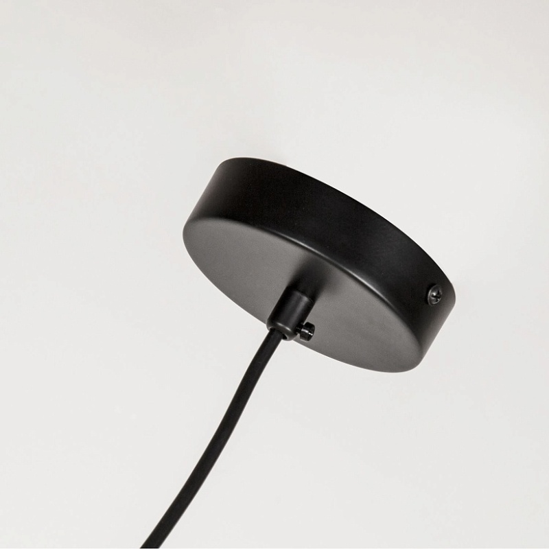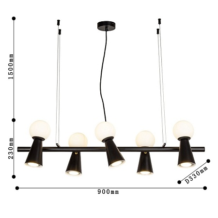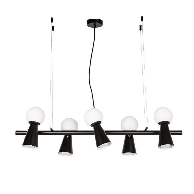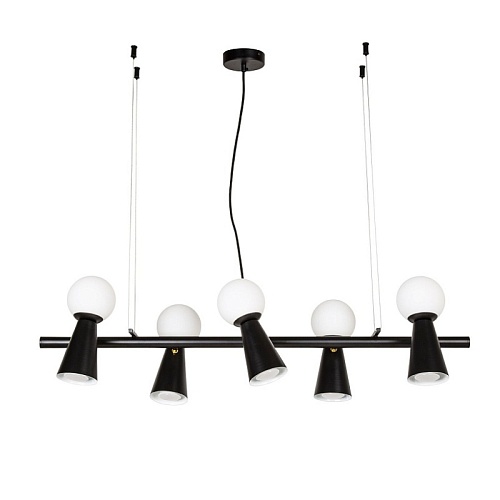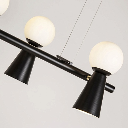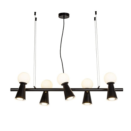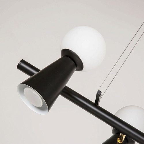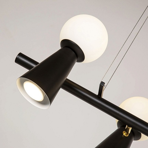 каркас черного цвета, поворотные плафоны с двумя источниками света - стеклянный выдувной матовый шар с лампой G9 и металлический конус с лампой GU10,