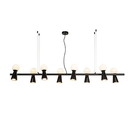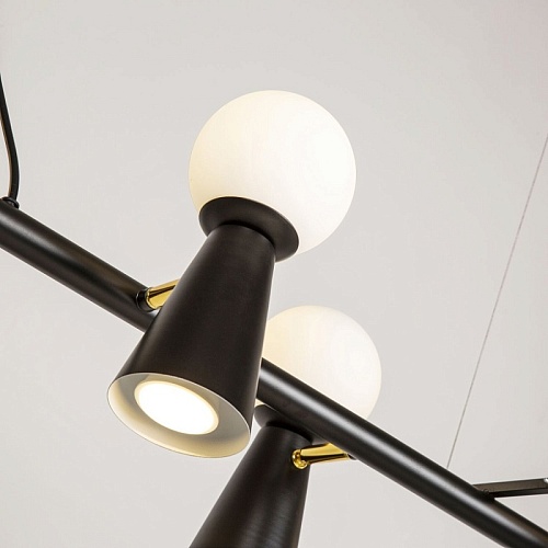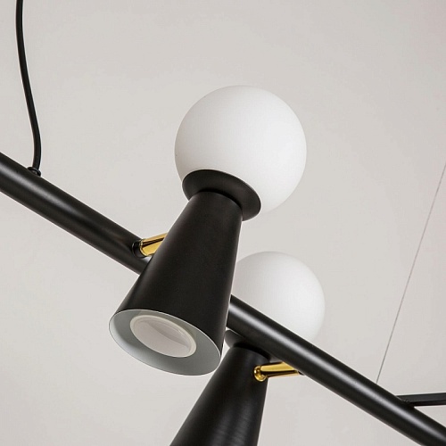каркас черного цвета, поворотные плафоны с двумя источниками света - стеклянный выдувной матовый шар с лампой G9 и металлический конус с лампой GU10,