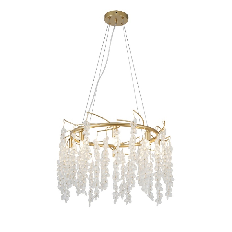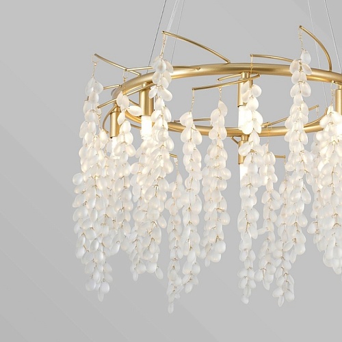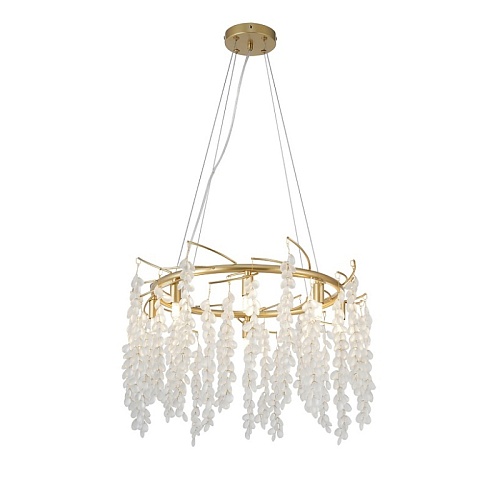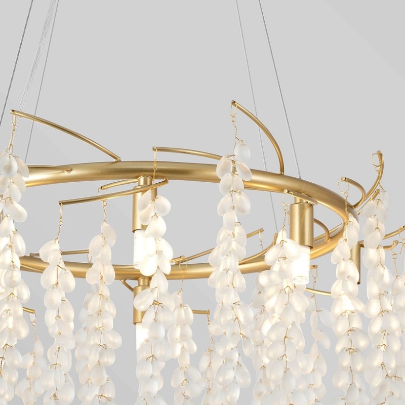 Каркас золотого цвета, декор из стёкол белого матового цвета в виде виноградной грозди. Высоту люстры можно регулировать. сменные лампы.