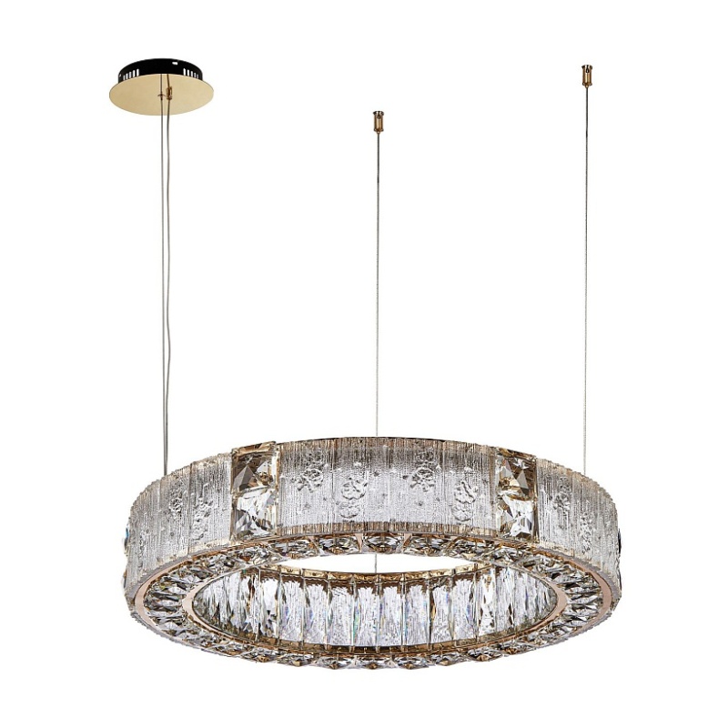 Каркас в цвете матовое золото, декор из матового рельефного стекла цвета шампанского по Муранской технологии, вставки из хрусталя в коньячном цвете, регулируемая высота.