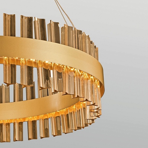 Металлический каркас золотого цвета, дымчато-серый хрусталь, регулируемая высота, встроенная лента LED.
