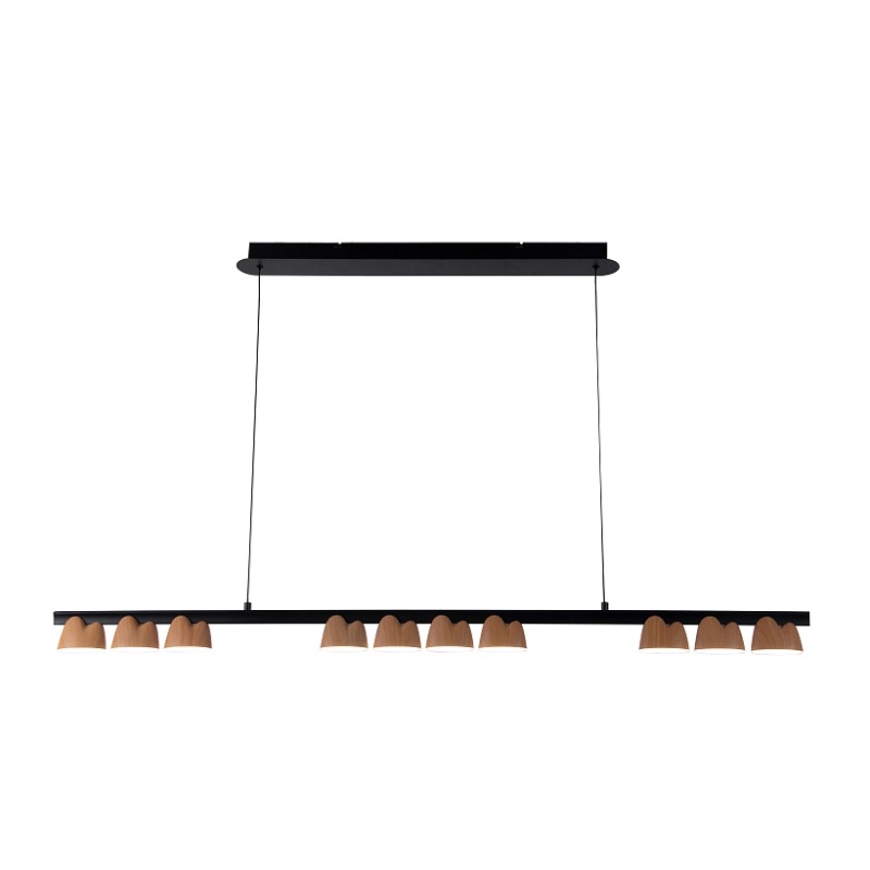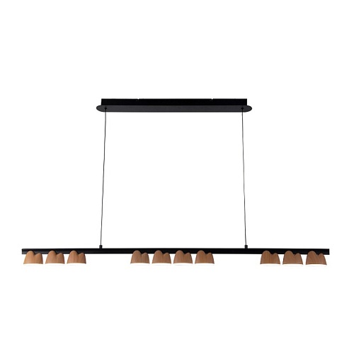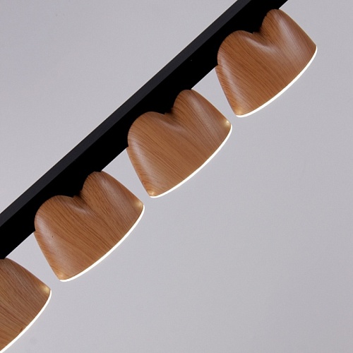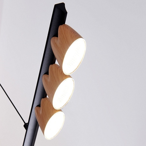 Металлический каркас черного матового цвета, плафоны цвета дерева, прозрачный акрил с узором, регулируемая высота.