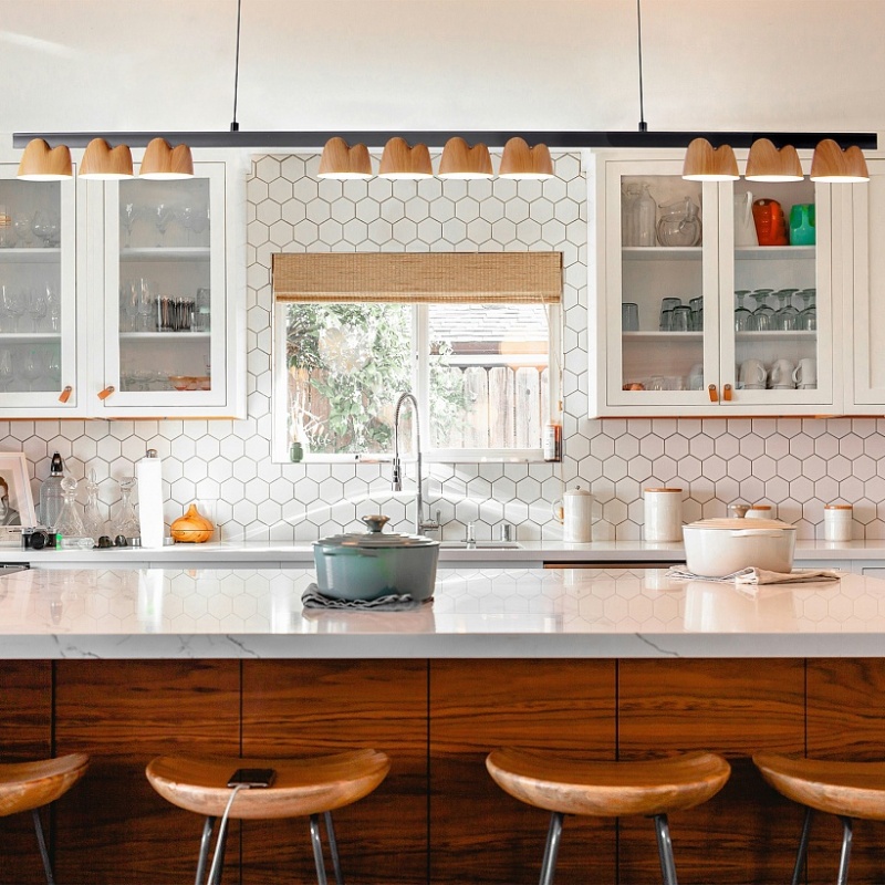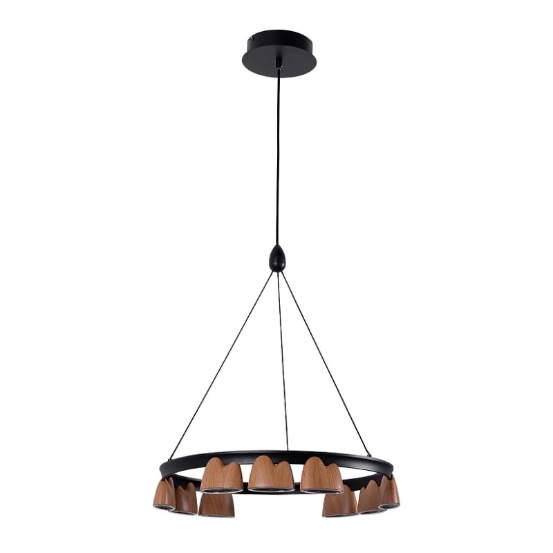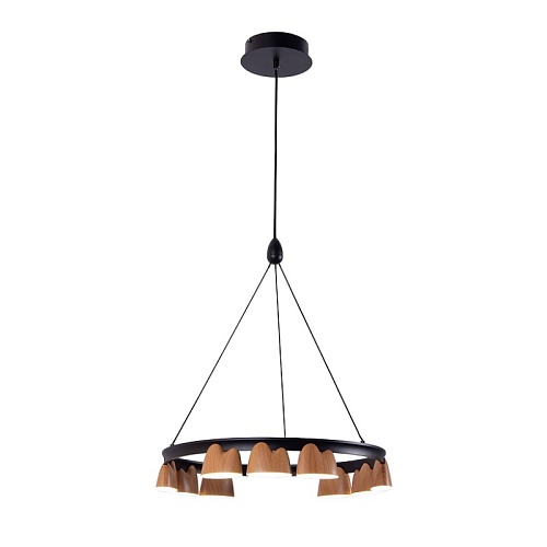 Металлический каркас черного матового цвета, плафоны цвета дерева, прозрачный акрил с узором, регулируемая высота.