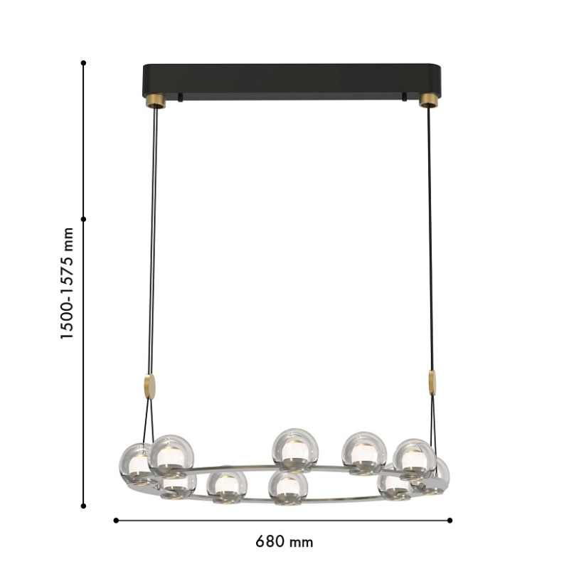 Металлический каркас черного цвета со сферическими плафонами, двойной источник света - внутри стеклянного плафона свет направлен вверх, спот в нижней части плафона светит вниз, регулируемая высота.