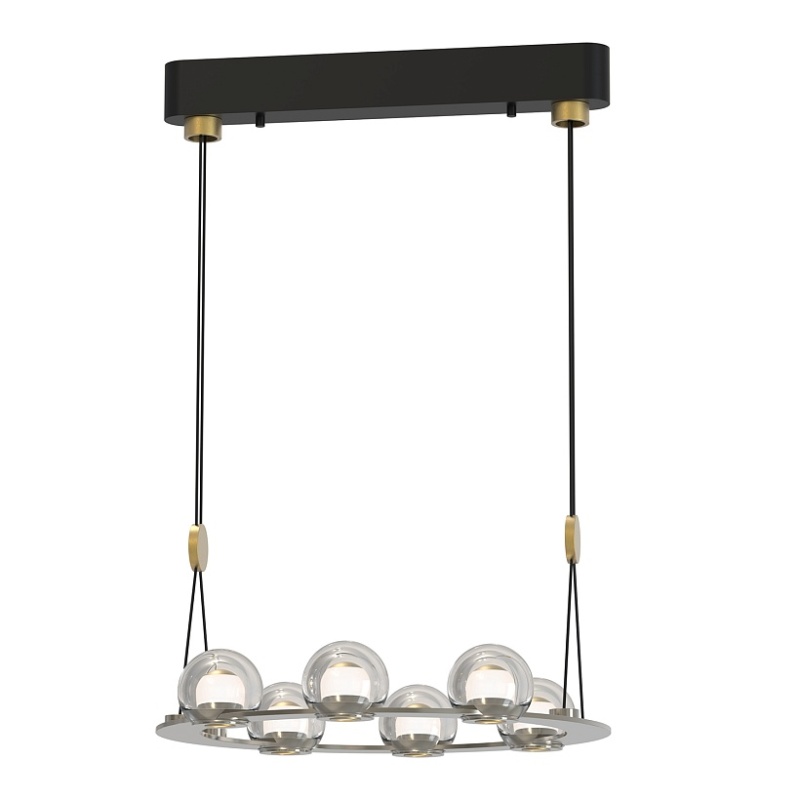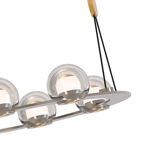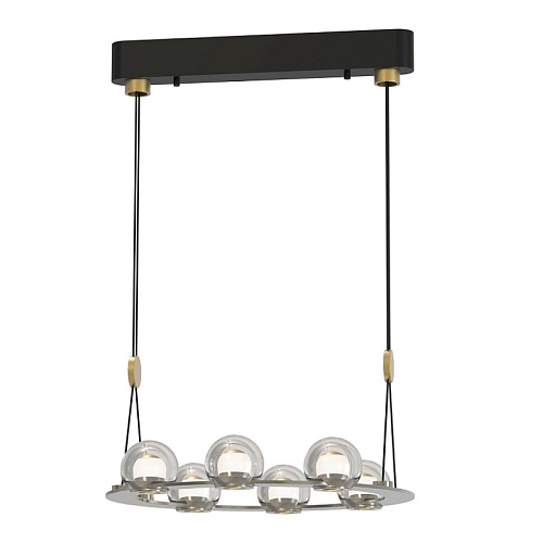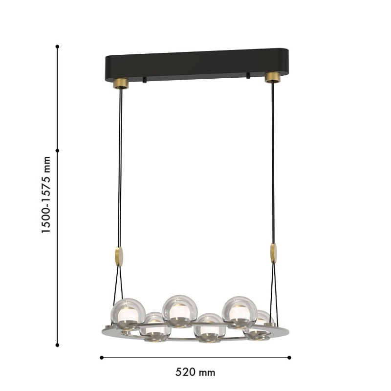 Подвесная люстра с черным каркасом, диаметром 52 см см со сферическими плафонами, двойной источник света - внутри стеклянного плафона свет направлен вверх, спот в нижней части плафона светит вниз, регулируемая высота.