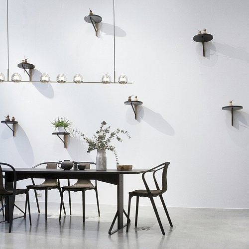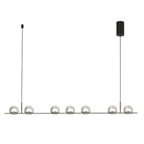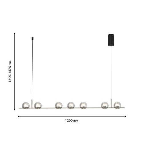 Металлический каркас черного цвета со сферическими плафонами, двойной источник света - внутри стеклянного плафона свет направлен вверх, спот в нижней части плафона светит вниз, регулируемая высота.