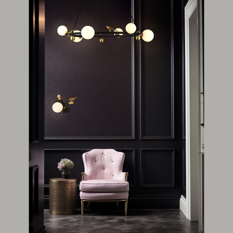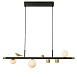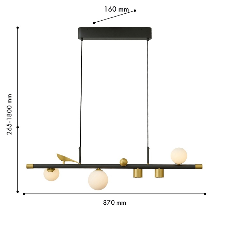 Металлический каркас черного матового цвета, круглые белые плафоны выполненные из выдувного стекла, два миниатюрных спота дают направленный вниз поток света, золотой декоративный элемент в виде птицы, регулируемая высота.