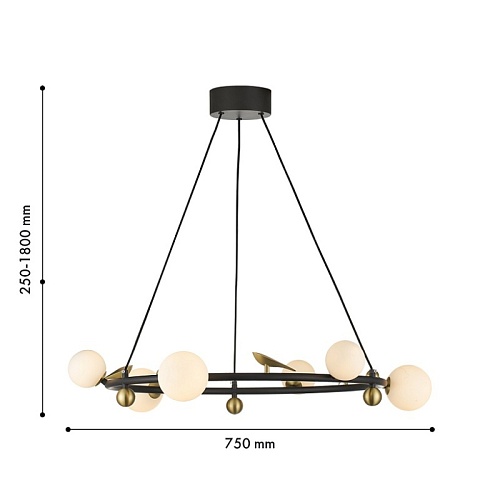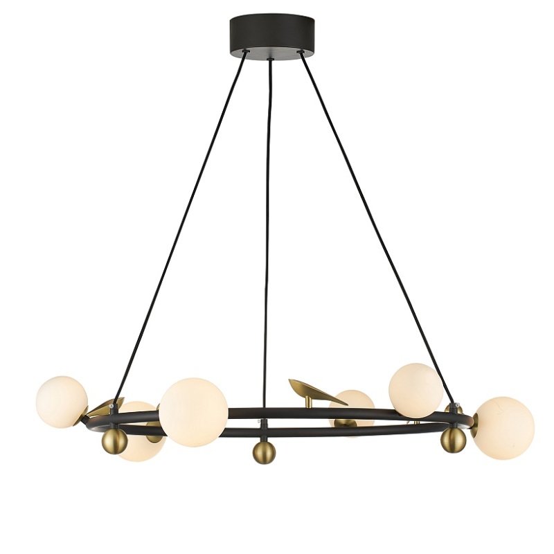 Металлический каркас черного матового цвета, круглые белые плафоны выполненные из выдувного стекла, золотые декоративные элементы в виде птицы и металлических шариков на каркасе, регулируемая высота.