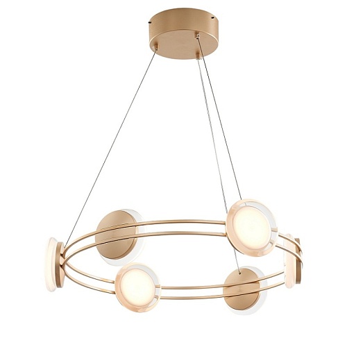 Металлический каркас золотого цвета, акриловые плафоны в виде дисков с прозрачным объемным ободком и плоской матовой внутренней частью со встроенным модулем LED, регулируемая высота.