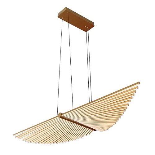 Подвесная люстра, каркас в цвете матовое золото, конструкция в виде распахнутых крыльев из тонких металлических планок, в которые встроены светодиодные ленты.