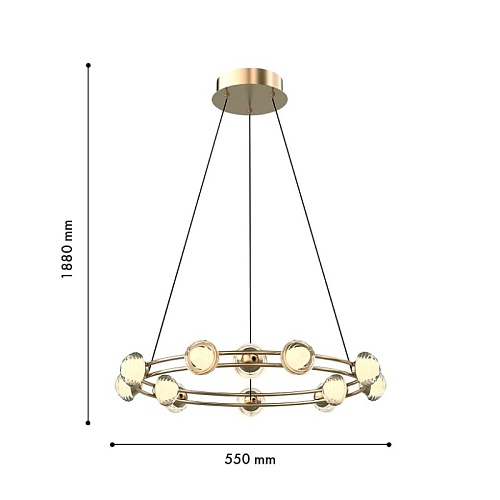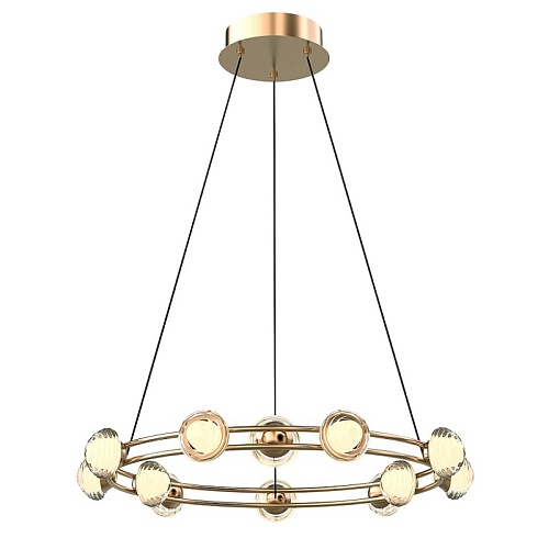 Каркас в цвете гальваническое золото, с тонкими металлическими кольцами и акриловыми рельефными плафонами, внутри которых расположена модуль LED, плафоны расположены как по внешнему, так и по внутреннему периметру кольца.