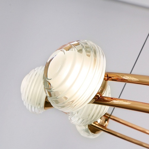 Каркас в цвете гальваническое золото, с тонкими металлическими кольцами и акриловыми рельефными плафонами, внутри которых расположена модуль LED, плафоны расположены как по внешнему, так и по внутреннему периметру кольца.
