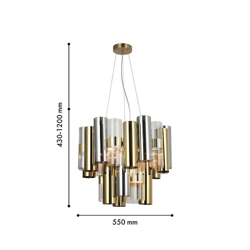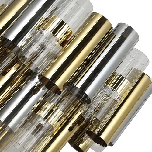 Каркас в цвете золото, декор плафона из стеклянных цилиндров, соединенных между собой, плафоны выполнены в трех цветах: зеркальный хром, зеркальное золото и прозрачный с декоративным рифлением и золотым ободком.