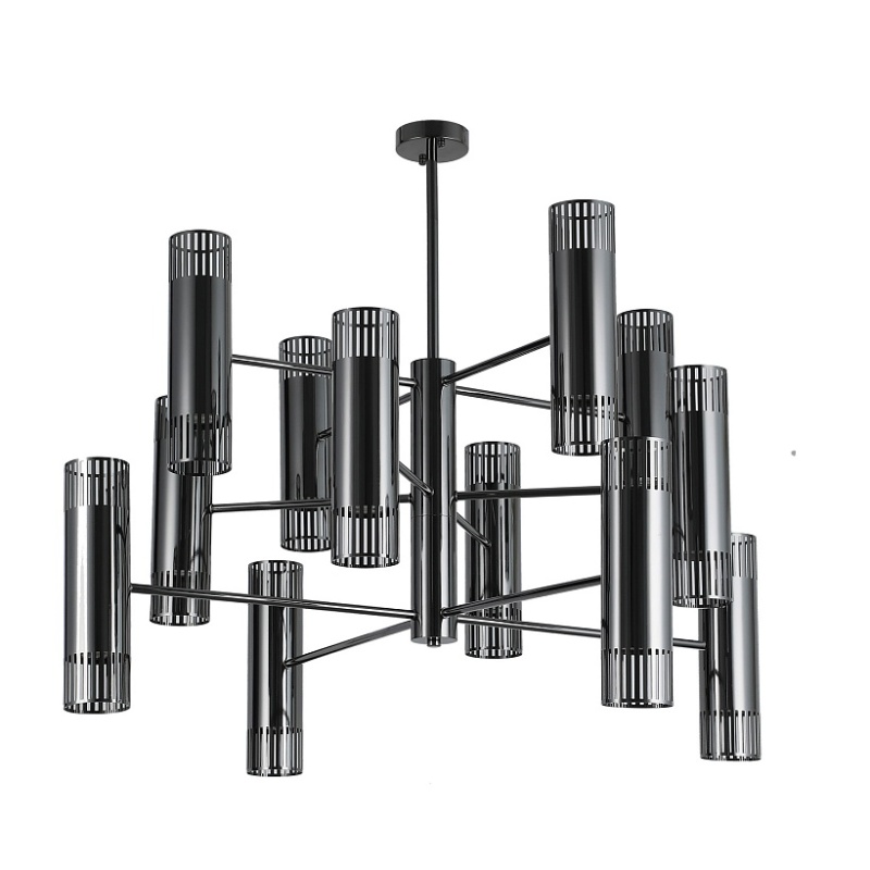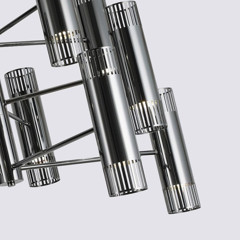 Каркас люстры в цвете черных хром, плафоны в форме удлиненного цилиндра с декоративными прорезями по краям, два источника света внутри плафонов, направленные вверх и низ, сменная лампа G10.