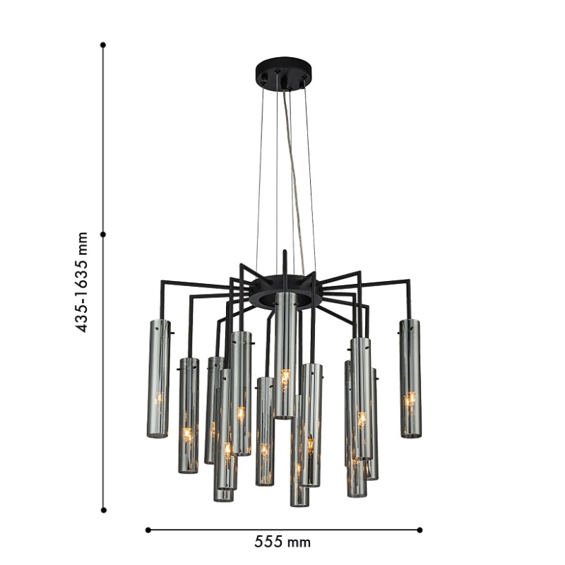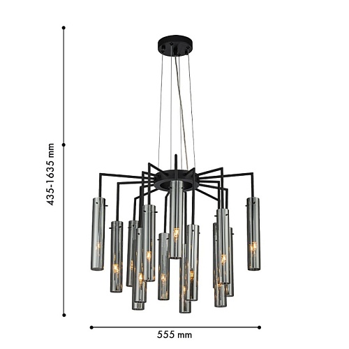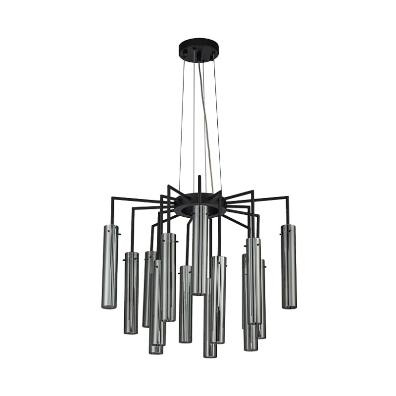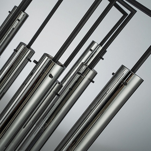 Каскадная люстра, каркас черного цвета, состоит из металлических трубок, изогнутых от центрального кольца под прямым углом, на конце каждой трубки расположен тонкий длинный плафон из стекла дымчато-серого цвета. сменная лампа G9, регулируемая высота.