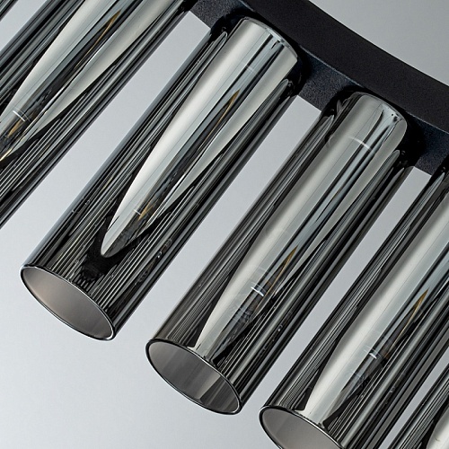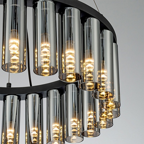 Металлический каркас черного цвета, плафоны из стекла дымчато-серого цвета цилиндрической формы. Сменные лампы G9. Универсальные крепления позволяют создавать конструкцию из нескольких колец.