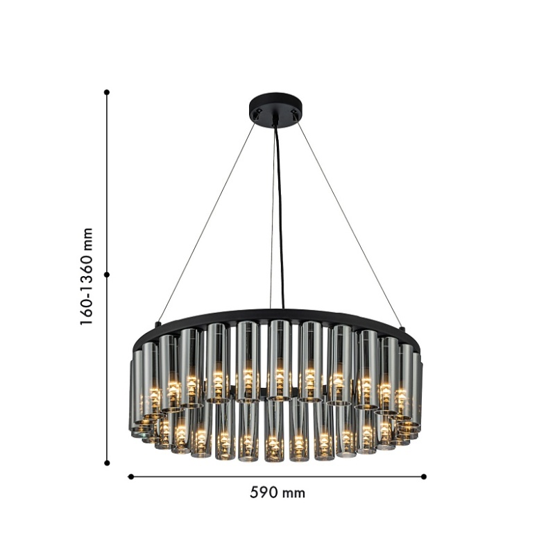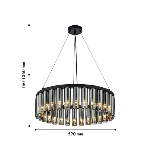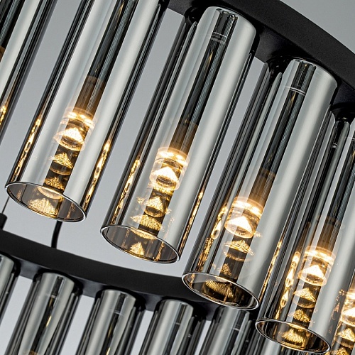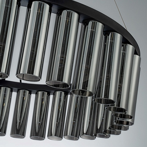 Металлический каркас черного цвета, плафоны из стекла дымчато-серого цвета цилиндрической формы. Сменные лампы G9. Универсальные крепления позволяют создавать конструкцию из нескольких колец.