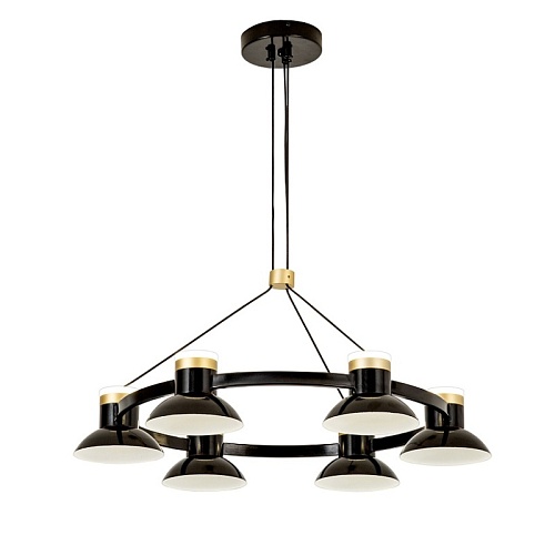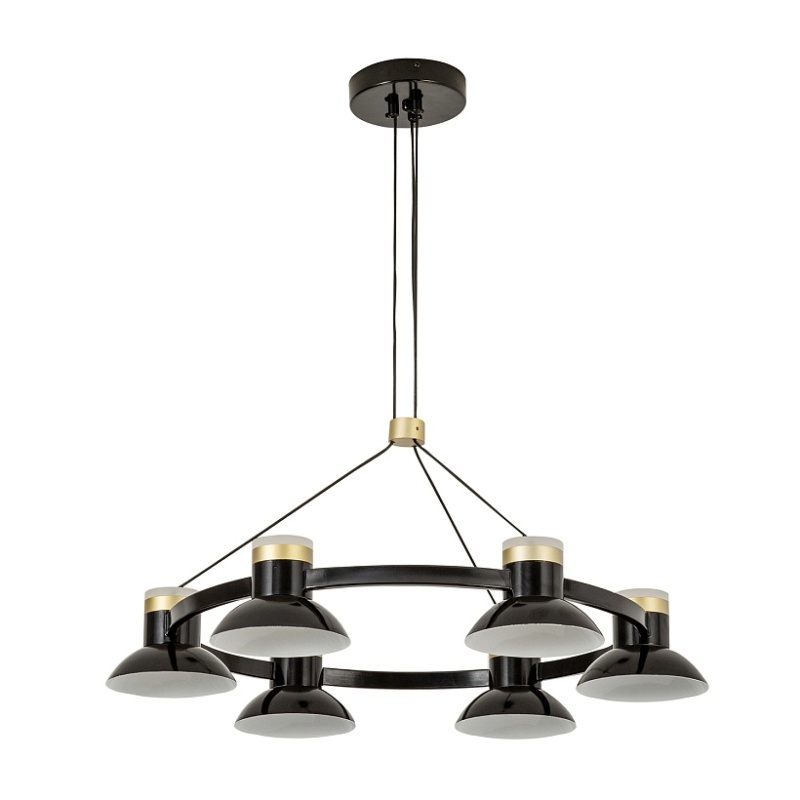 Черный глянцевый металлический каркас, акриловый плафон внутри абажура, дополнительный декоративный источник света в верхней части абажура, декоративный элемент из металла в цвете матовое золото.