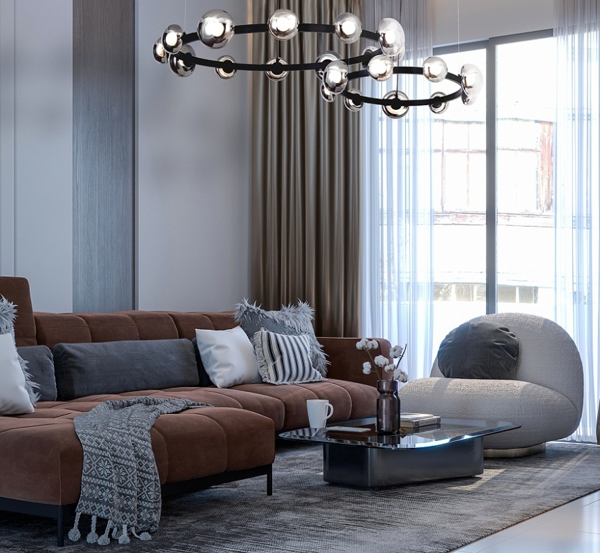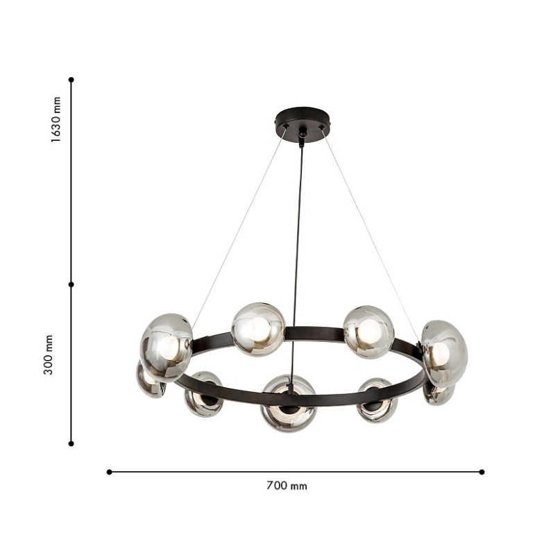 Металлический каркас черного цвета с дымчато-серыми выдувными плафонами. Плафоны оригинальной формы в двух размерах расположены по внешней стороне кольца, а внутренний модуль LED обеспечивает яркое и равномерное освещение.