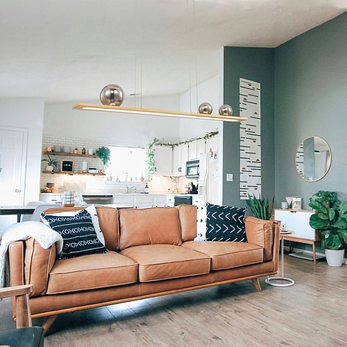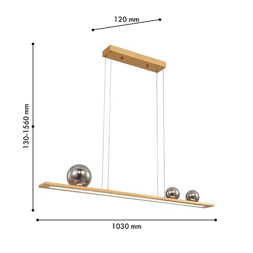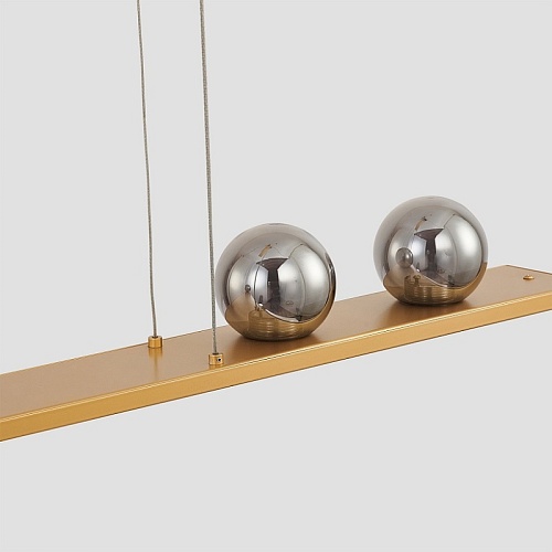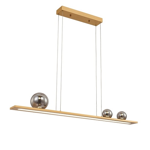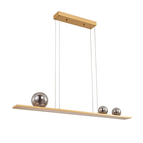 Подвес удлиненной прямоугольной формы в цвете золото. Основной источник света LED направлен вниз, декоративные зеркально-серые плафоны из стекла, ассиметрично расположены в верхней части и также оснащены встроенными модулями LED.