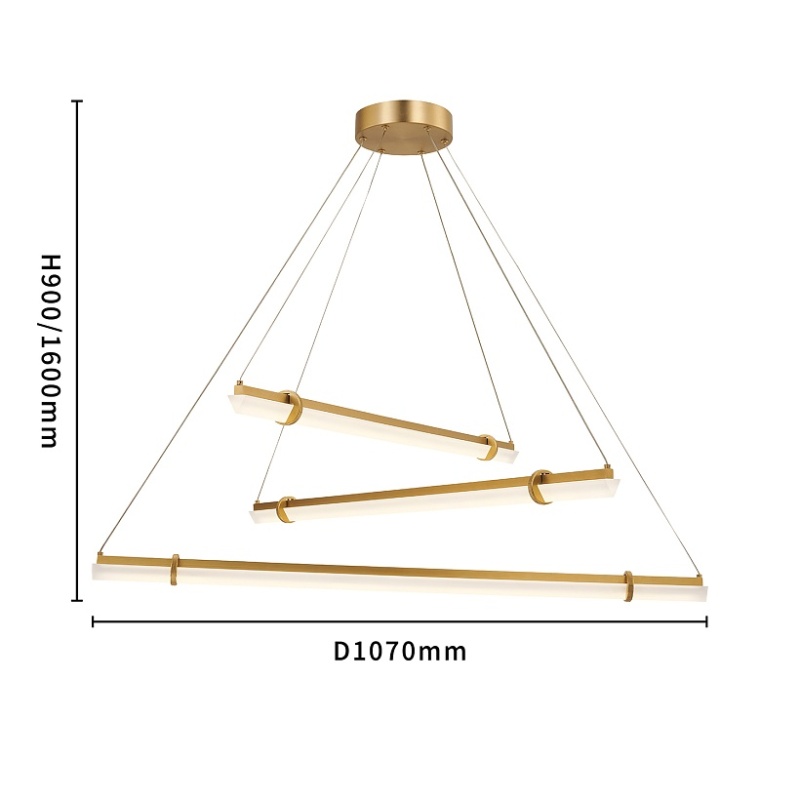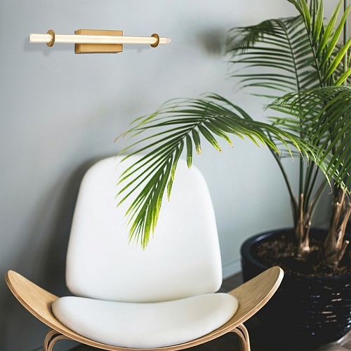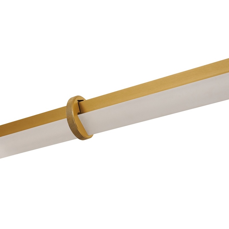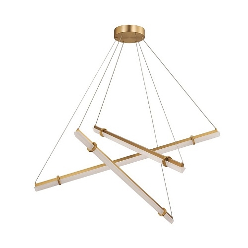 Металлический каркас в матовом латунном цвете и акриловый плафон белого цвета, имеющий форму треугольного бруска. Элементы плафона скреплены декоративными крепежами.