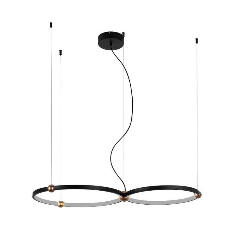 Люстра, составленная из колец разных размеров, собранных в композицию. Каркас в черном цвете, декоративные элементы в виде шаров в цвете матовое золото, встроенная LED-лента, рассеиватель из белого акрила, регулируемая высота.