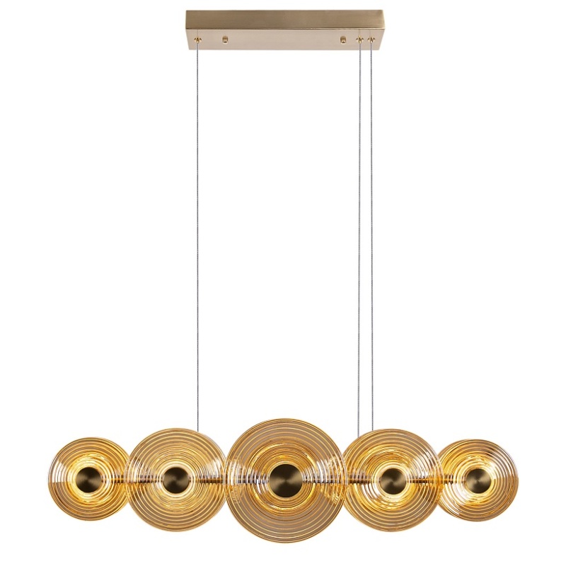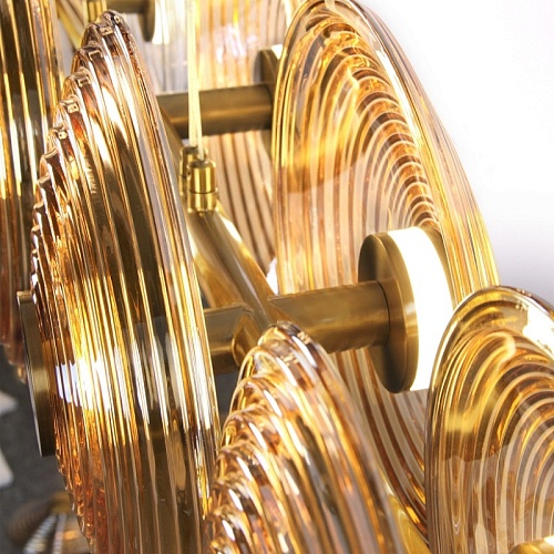 Металлический каркас в цвете латунь, плафоны из стекла янтарного цвета с объемной структурой колец, встроенный LED-модуль, регулируемая высота.