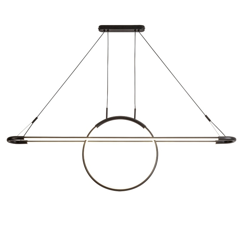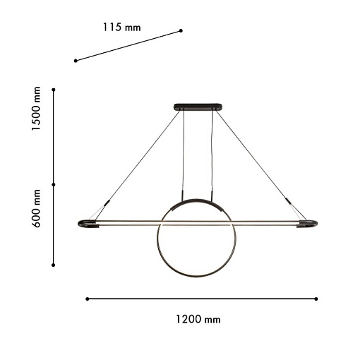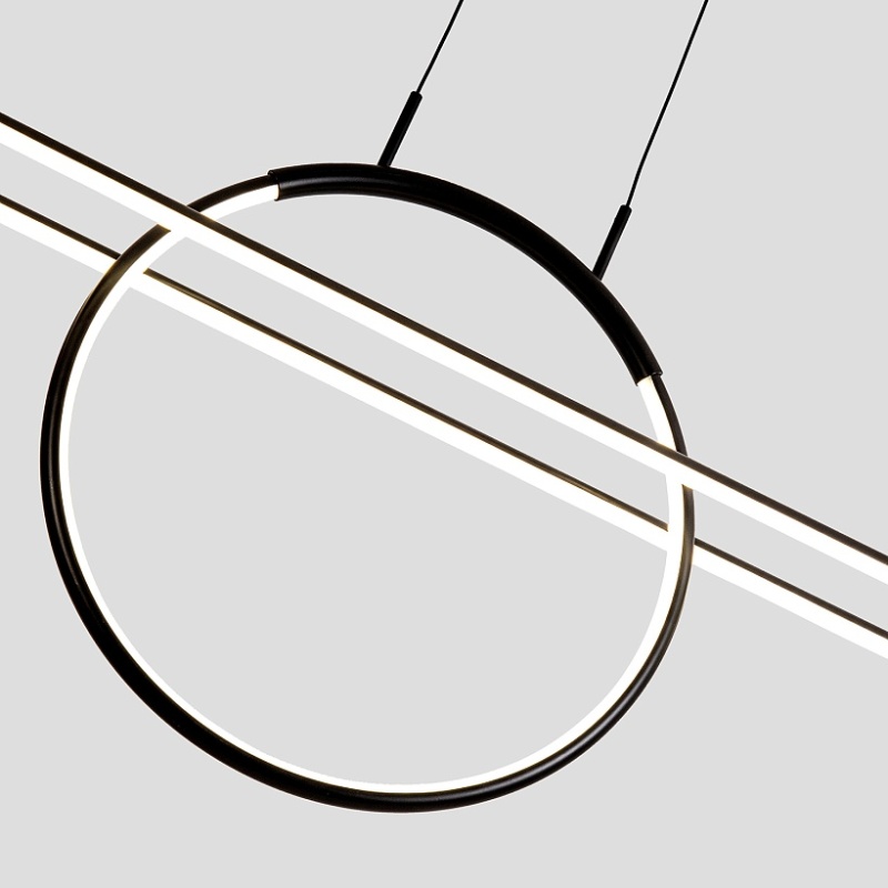 Подвесная люстра, металлический каркас черного матового цвета, рассеиватель из акрила, возможность менять высоту внешнего плафона с помощью подъема и опускания центрального элемента - кольца, модуль LED.