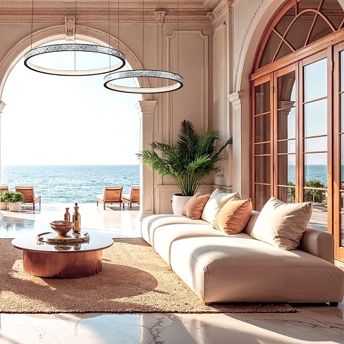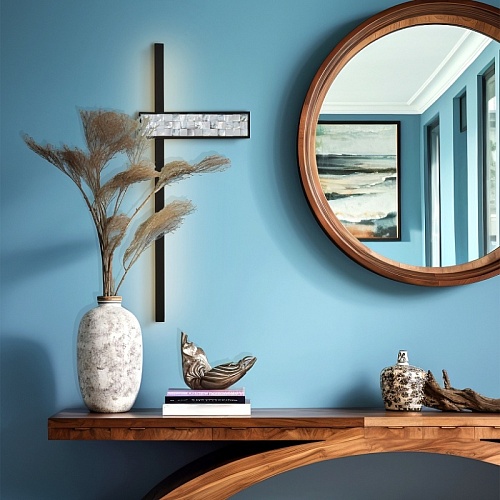 Металлический каркас черного цвета, LED-лента с рассеивателем из прозрачного поликарбоната, внешняя сторона плафона декорирована перламутровыми квадратиками из морских ракушек, регулируемая высота.