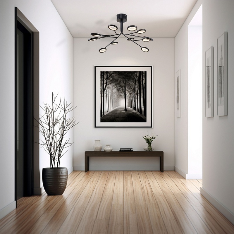 Металлический каркас матового черного цвета, внутренний периметр плафонов подсвечен лентой-LED, рассеиватель из акрила с нанесенным на него круговым узором, регулируемая высота.