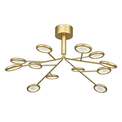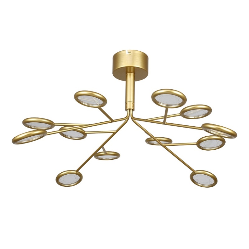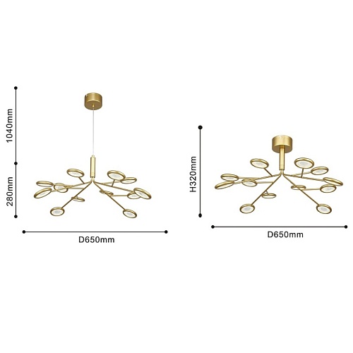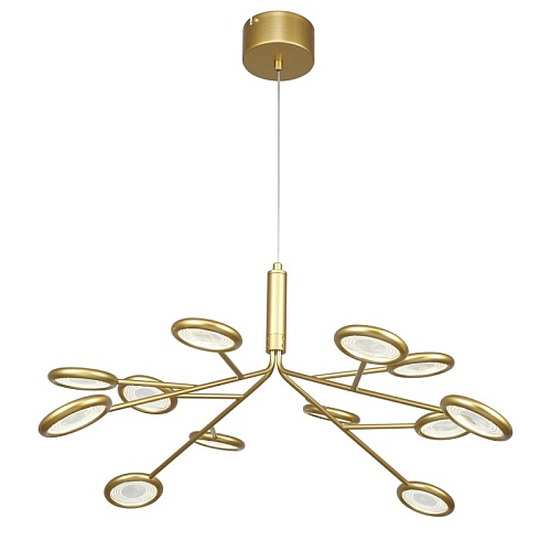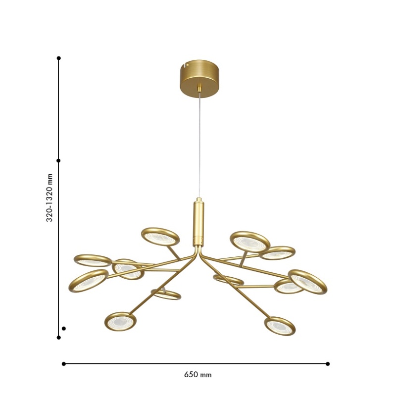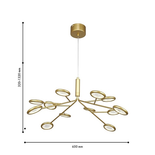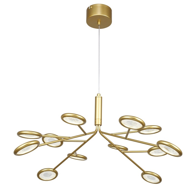Металлический каркас в цвете матовое золото, внутренний периметр плафонов подсвечен лентой-LED, рассеиватель из акрила с нанесенным на него круговым узором, регулируемая высота.