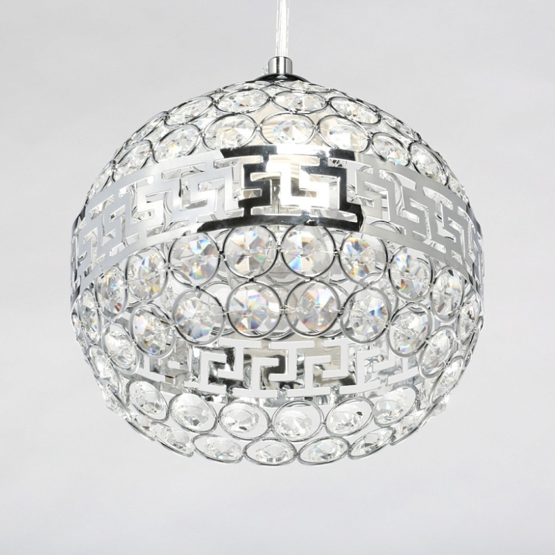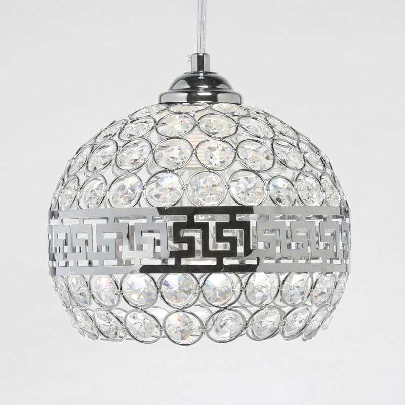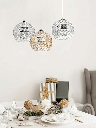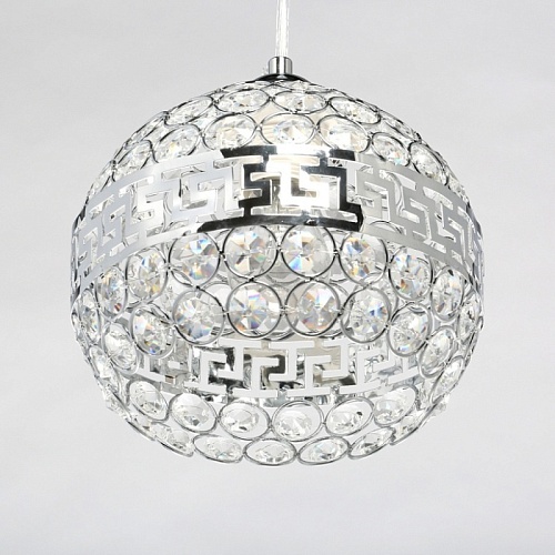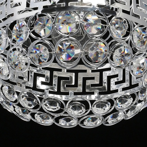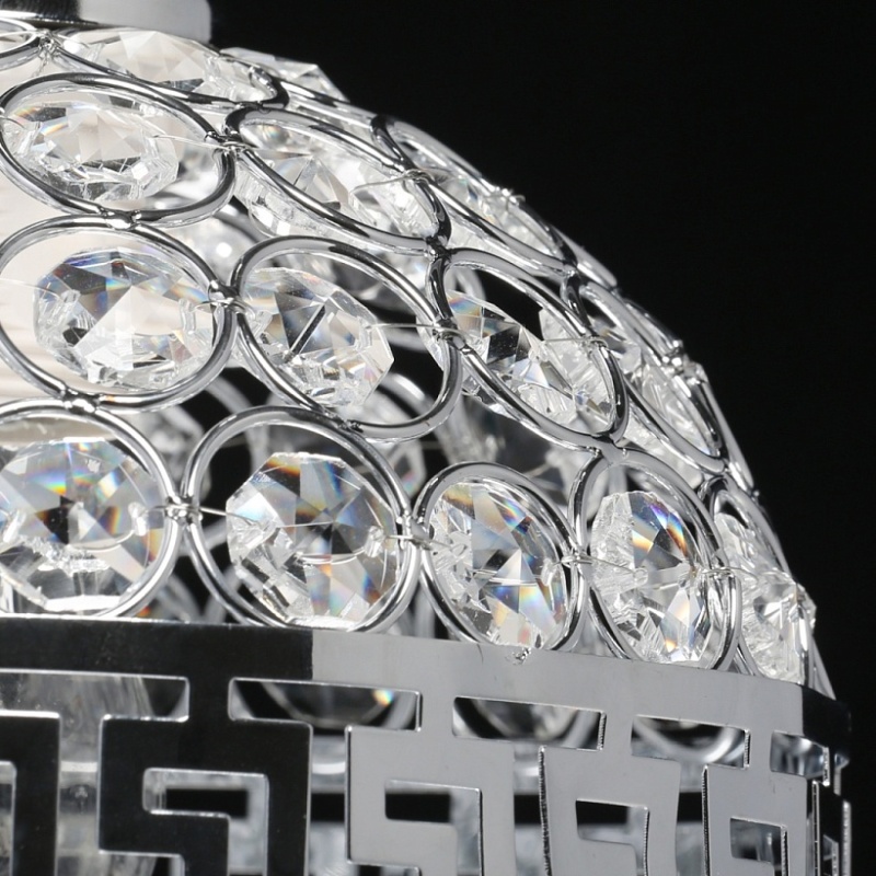 Основание светильника выполнено из металла и гальванизировано в цвет хрома. Светильник декорирован прозрачным хрусталем.