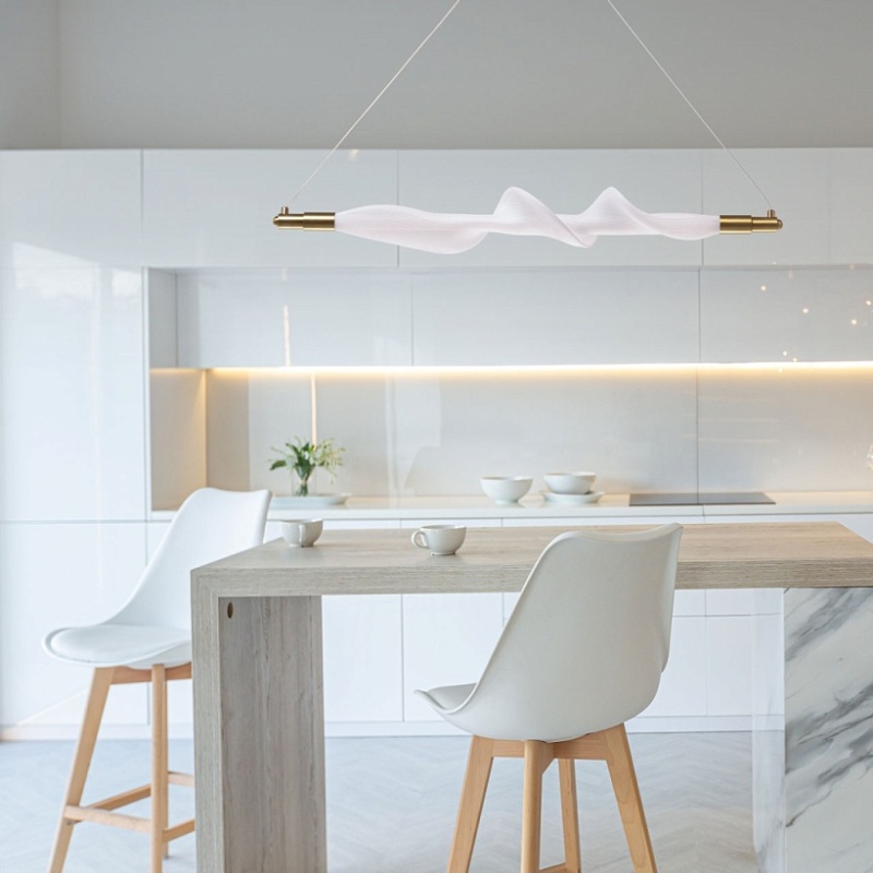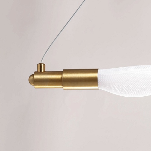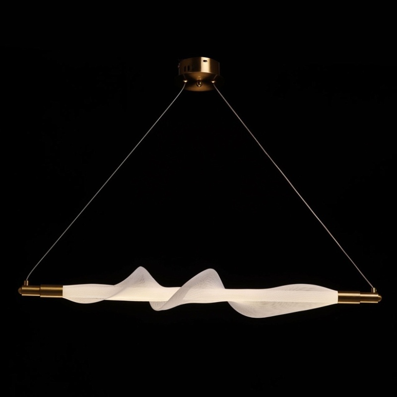 Металлическое основание горизонтальной люстры гальванизировано в цвет бронзы. Светодиодный источник света закрыт белым матовым акрилом и оригинальным плафоном в виде волны. Волна плафона выполнена из акрила ячеечной структуры.