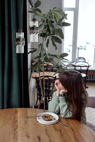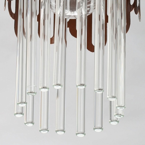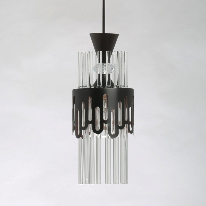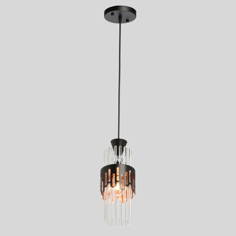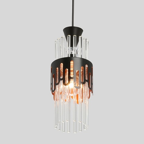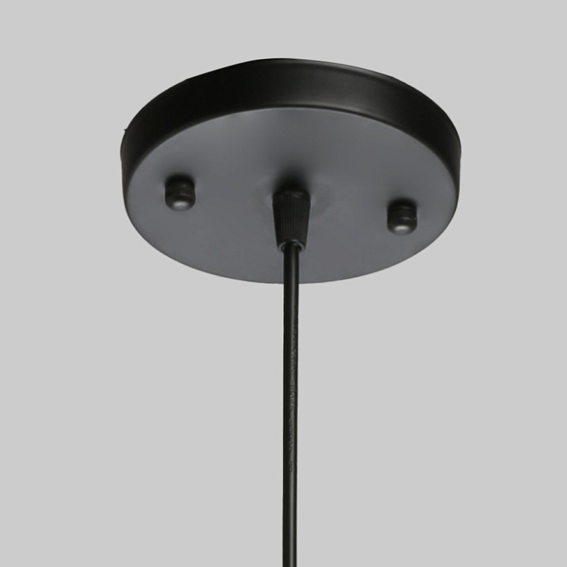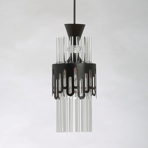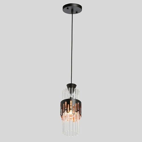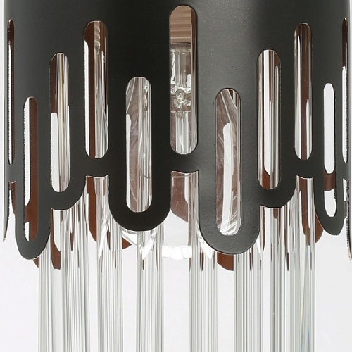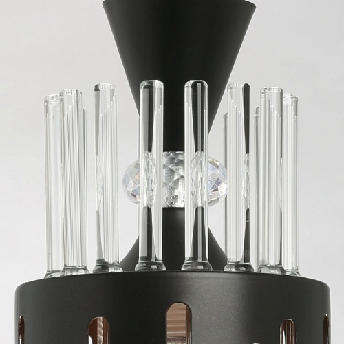 Металлическое основание и плафон подвесного светильника окрашены в черный цвет. Декор выполнен из прозрачного стекла