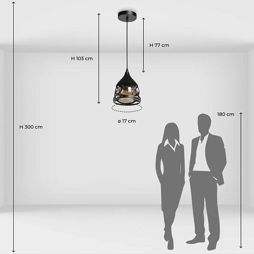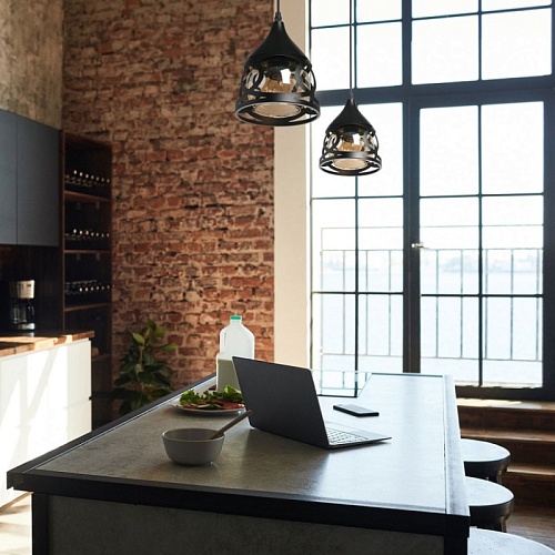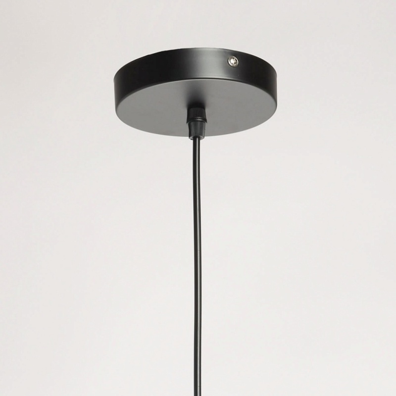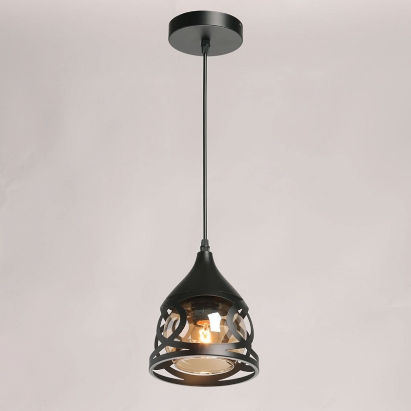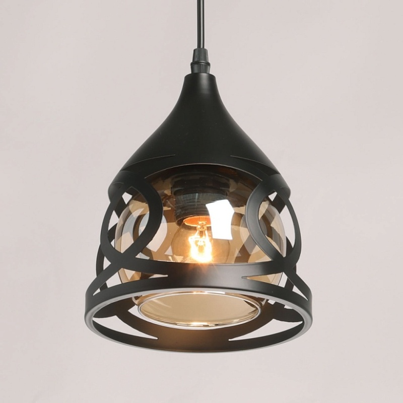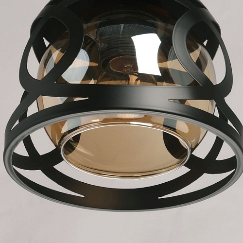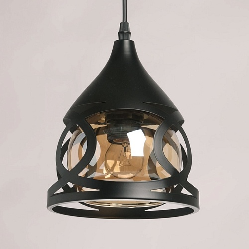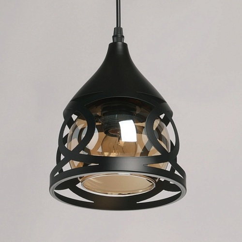Металлическое основание подвеса окрашено в черный цвет. Источник света закрыт двойным плафоном. Внешний плафон выполнен из металла и окрашен в цвет основания. Внутренний плафон отлит из стекла, гальванизированного в цвет коньяк.