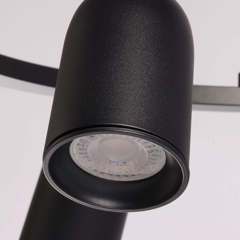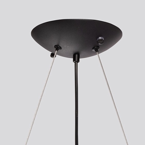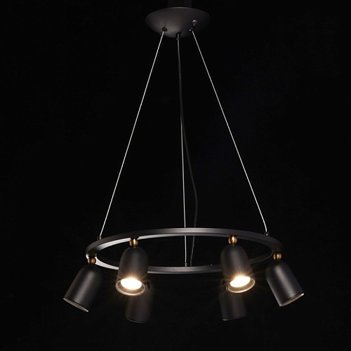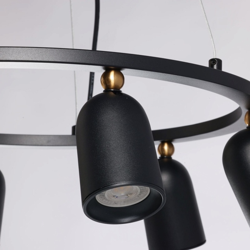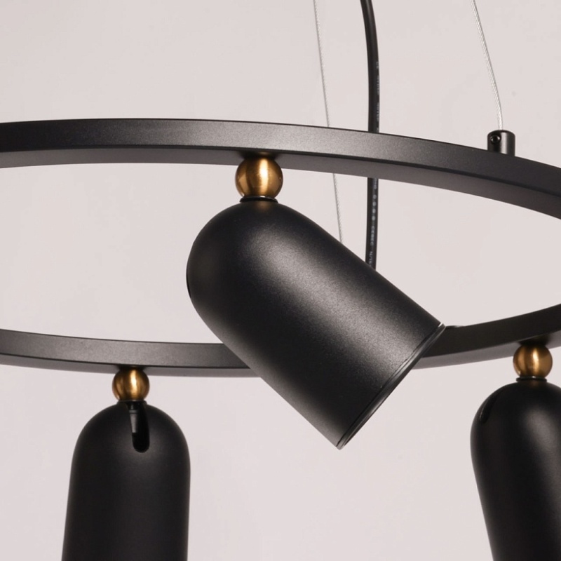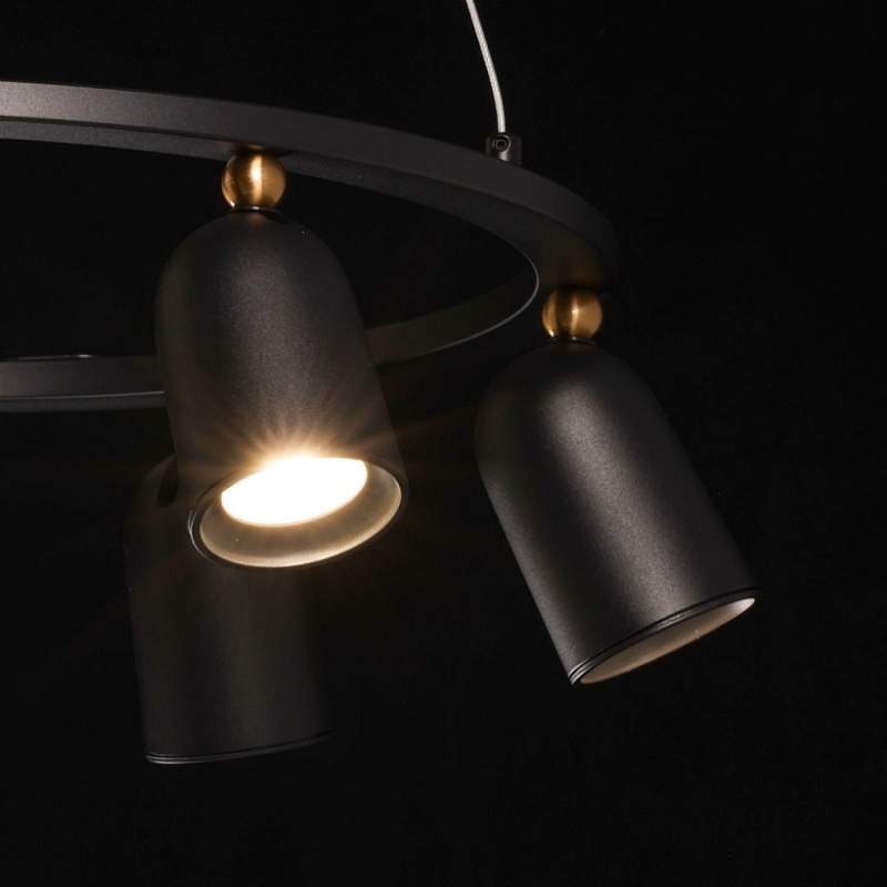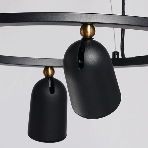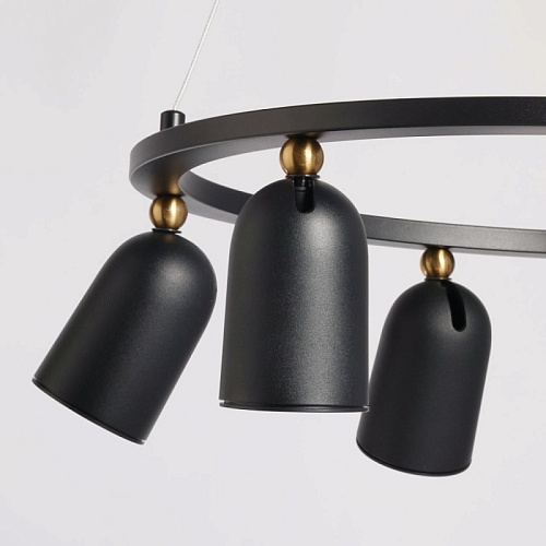 Металлическое основание подвесной люстры окрашено в черный цвет. Корпус плафонов выполнен из сплава алюминия и окрашен в цвет основания. Светильник декорирован металлическими сферами, гальванизированными в цвет латуни.