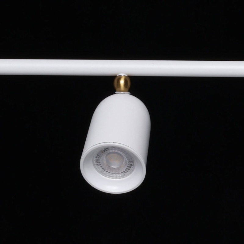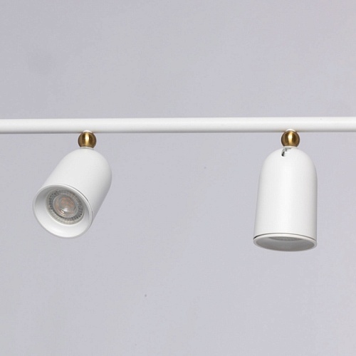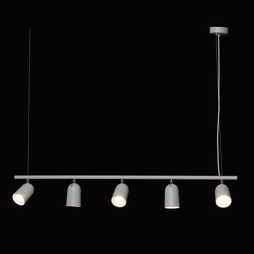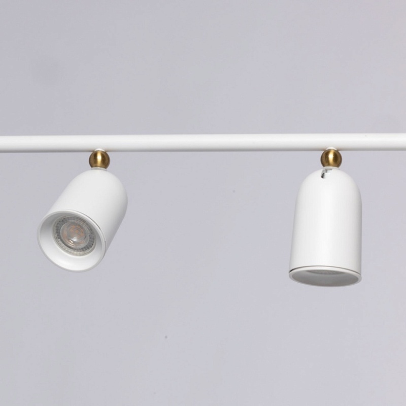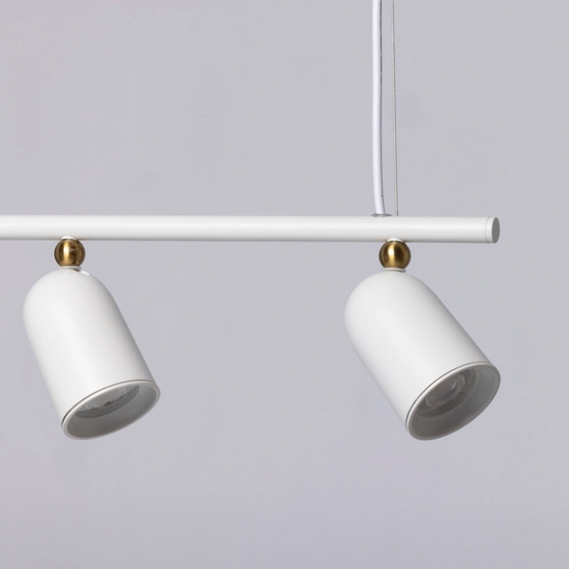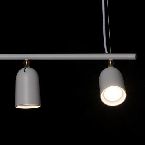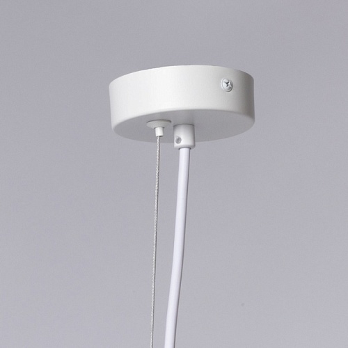 Металлическое основание подвесной люстры окрашено в белый цвет. Корпус плафонов выполнен из сплава алюминия с цинком и окрашен в цвет основания. Светильник декорирован металлическими сферами, гальванизированными в цвет латуни.