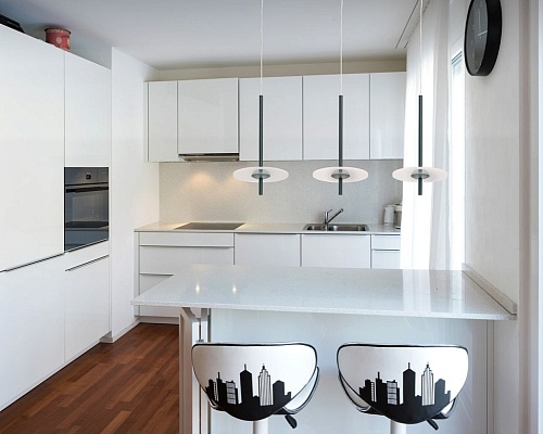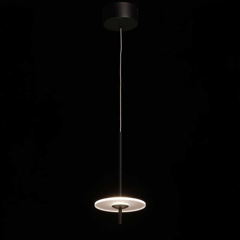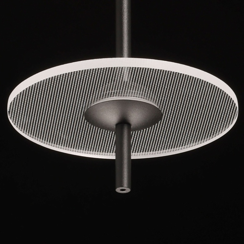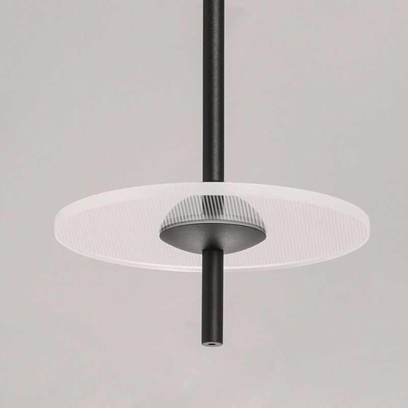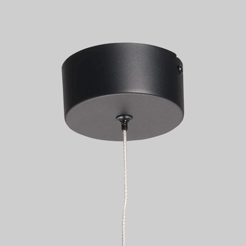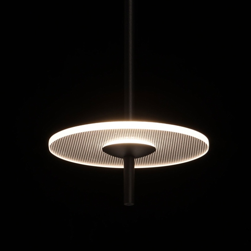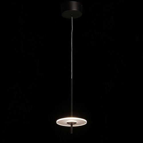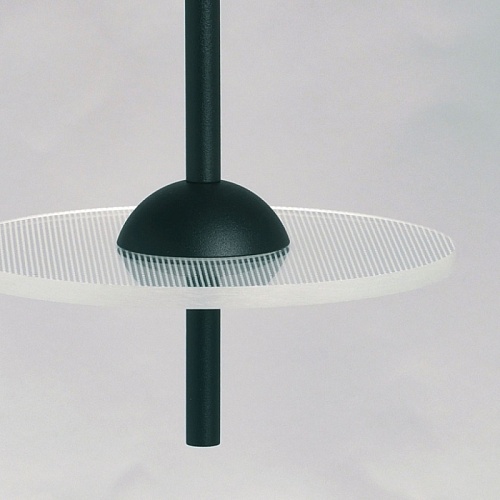 Металлическое основание подвеса обработано по технологии порошкового окрашивания в черный цвет. Плафон в виде диска выполнен из прозрачного акрила.