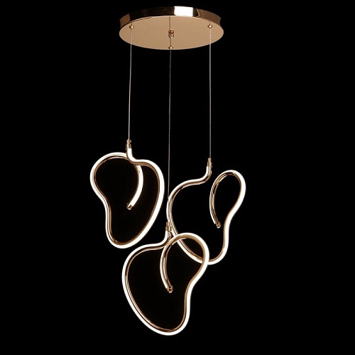 Металлическое основание подвесной люстры гальванизировано в цвет французского золота. Корпус плафонов выполнен из акрила и гальванизирован в цвет основания. Светодиодные источники света закрыты белым матовым силиконом.