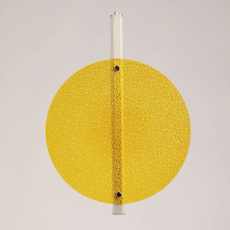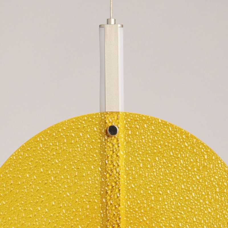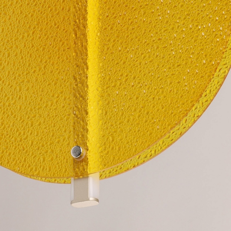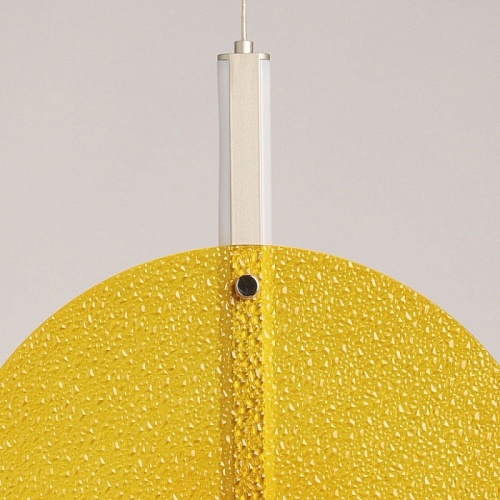 Металлическое основание подвеса гальванизировано в цвет никеля. Корпус плафона выполнен из сплава алюминия с цинком и гальванизирован в цвет основания. Светодиодные источники света закрыты матовым акрилом. Подвес декорирован фактурным стеклом, окрашенным в массе в желтый цвет.
