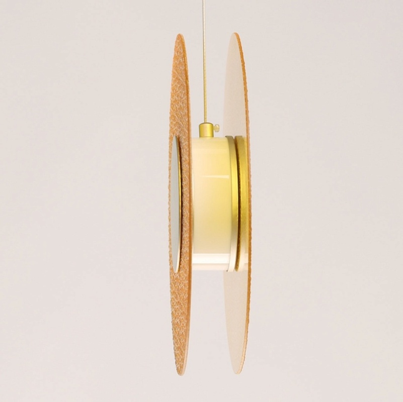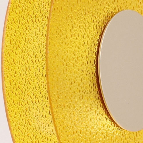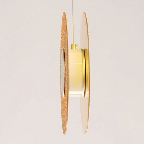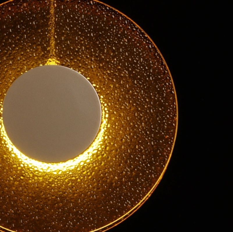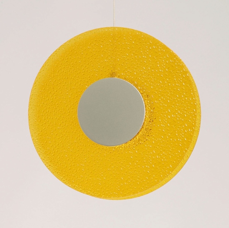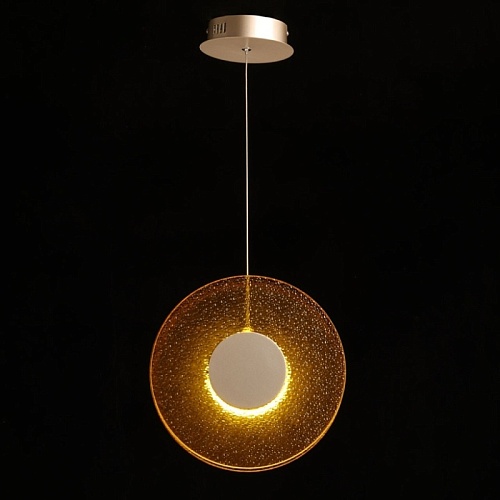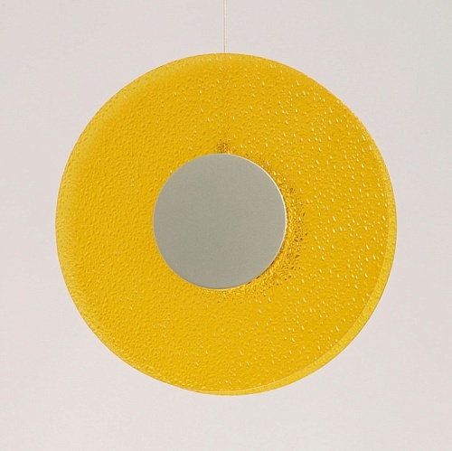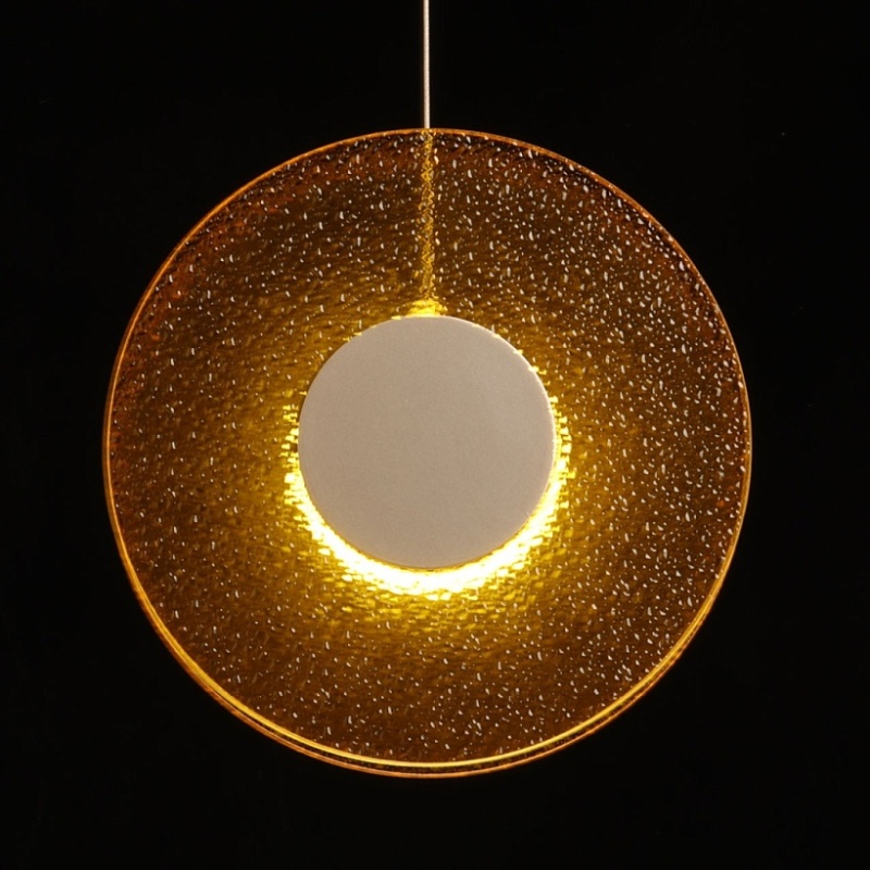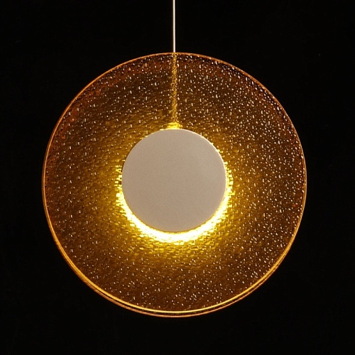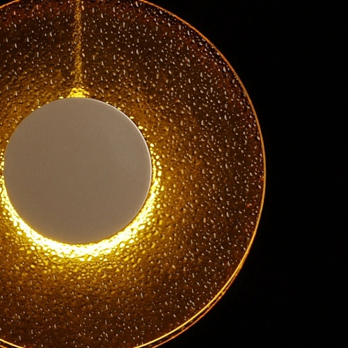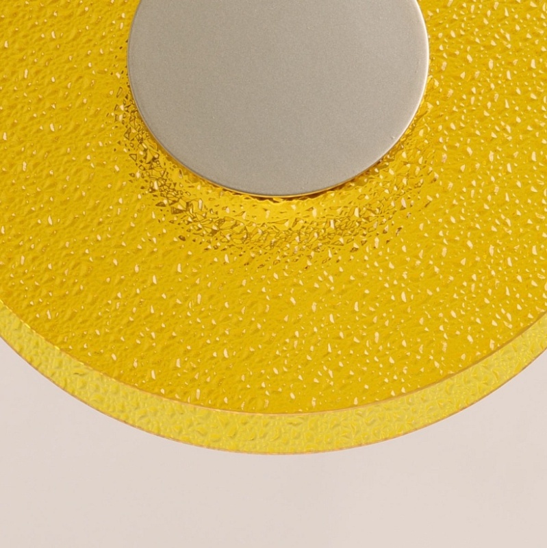 Металлическое основание подвеса гальванизировано в цвет никеля. Корпус плафона выполнен из сплава алюминия с цинком и гальванизирован в цвет основания. Светодиодные источники света закрыты матовым акрилом. Подвес декорирован фактурным стеклом, окрашенным в массе в желтый цвет.