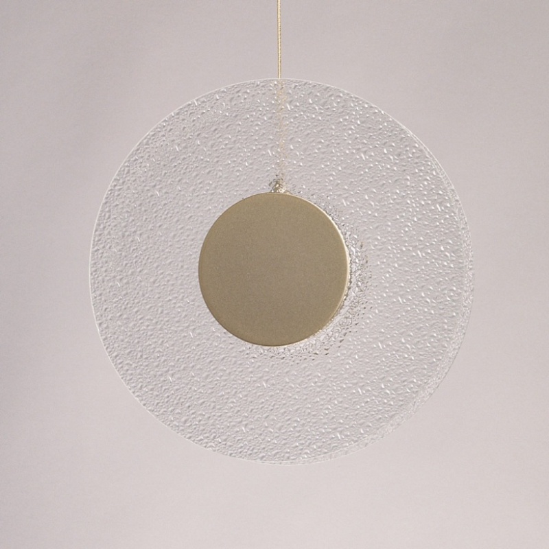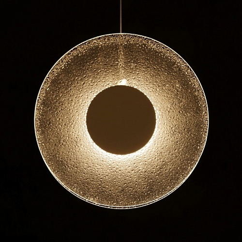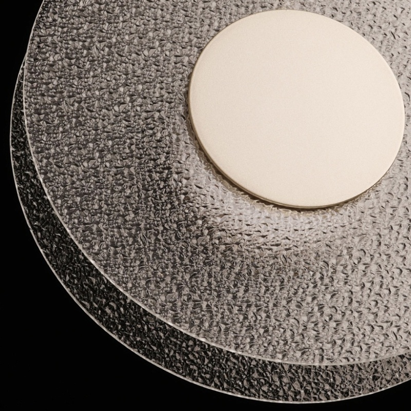 Металлическое основание подвеса гальванизировано в цвет никеля. Корпус плафона выполнен из сплава алюминия с цинком и гальванизирован в цвет основания. Светодиодные источники света закрыты матовым акрилом. Подвес декорирован прозрачным фактурным стеклом.