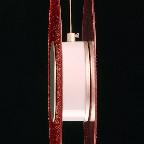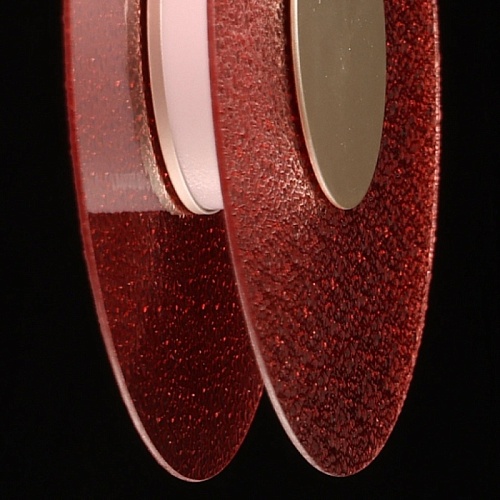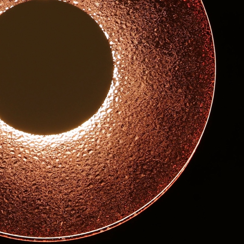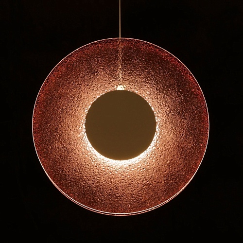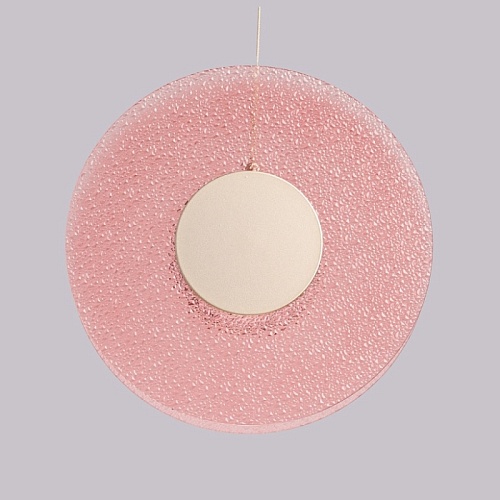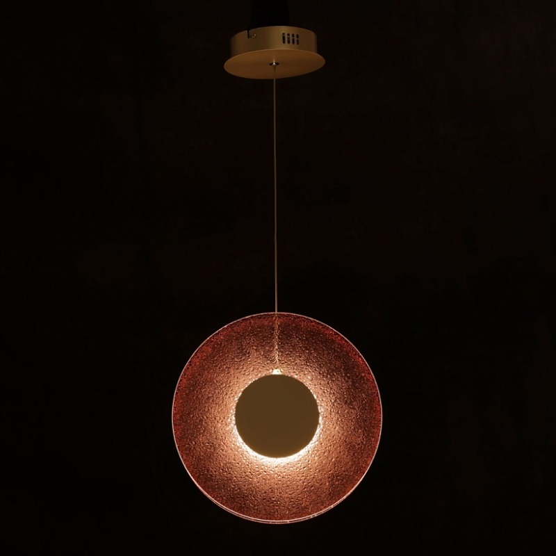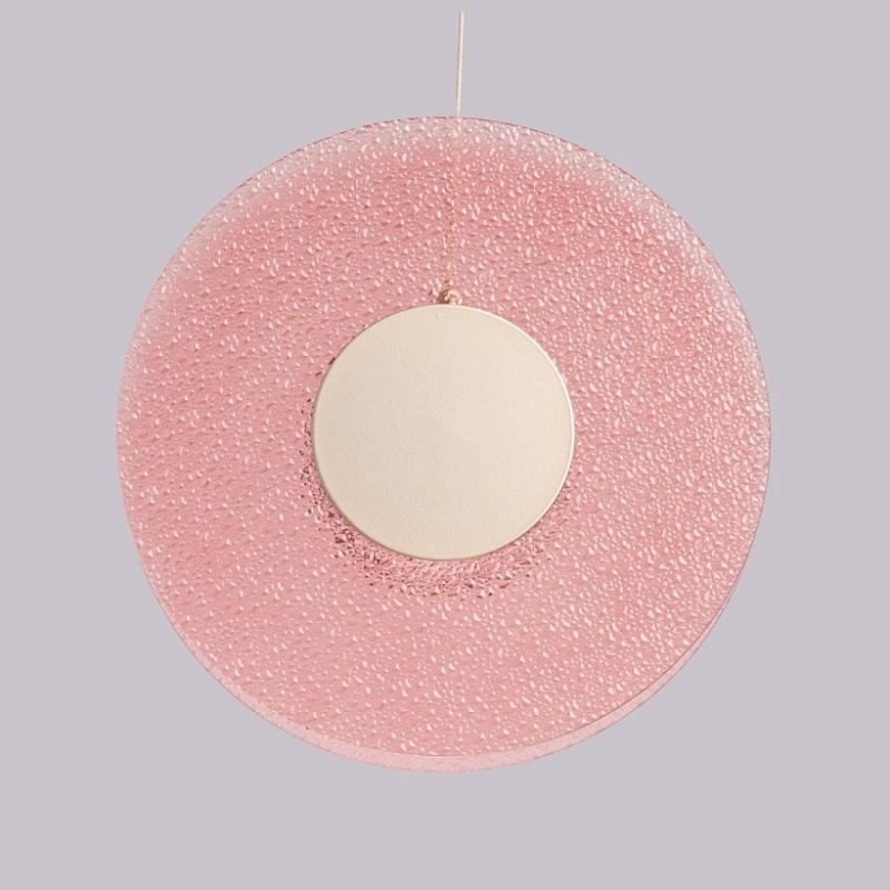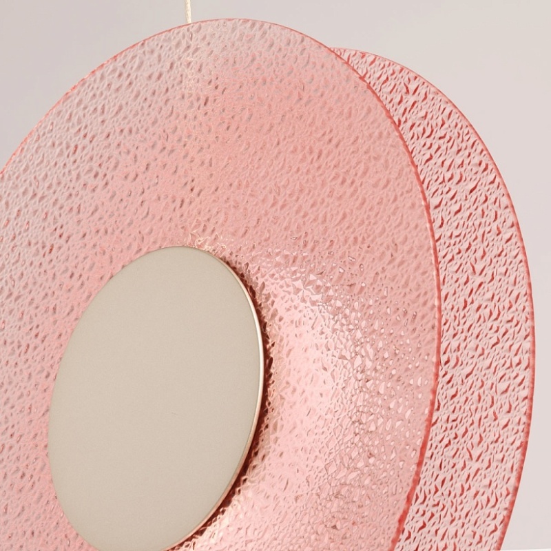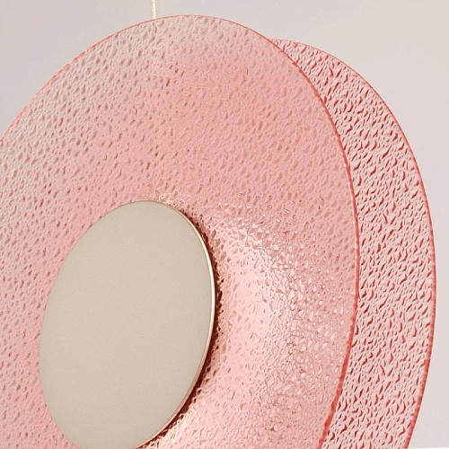 Металлическое основание подвеса гальванизировано в цвет никеля. Корпус плафона выполнен из сплава алюминия с цинком и гальванизирован в цвет основания. Светодиодные источники света закрыты матовым акрилом. Подвес декорирован фактурным стеклом, окрашенным в массе в розовый цвет.