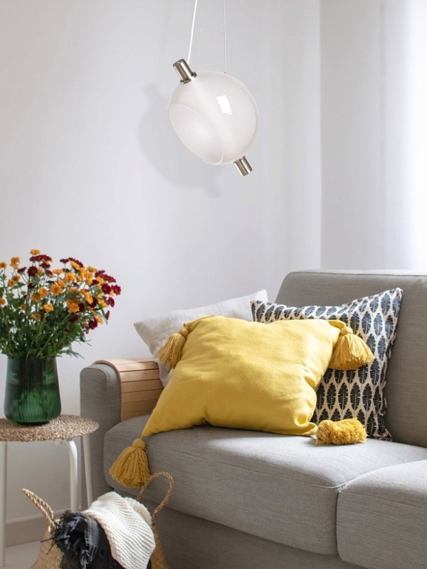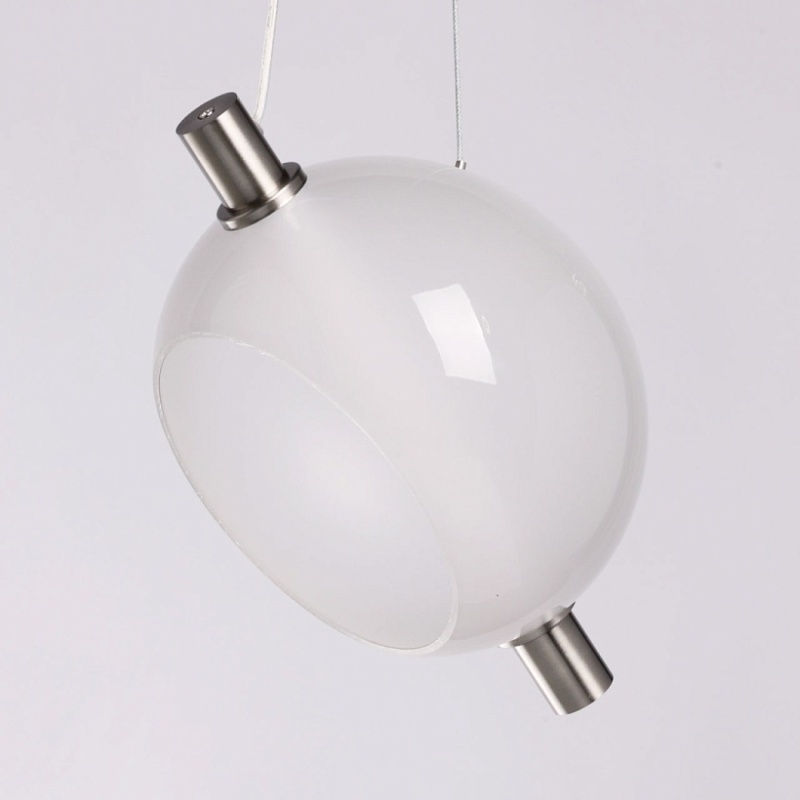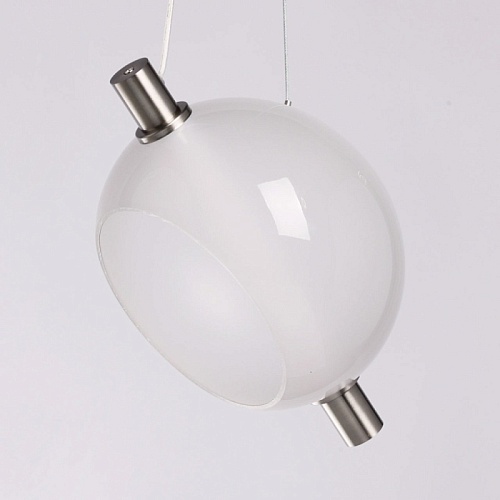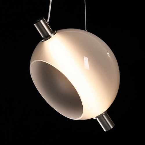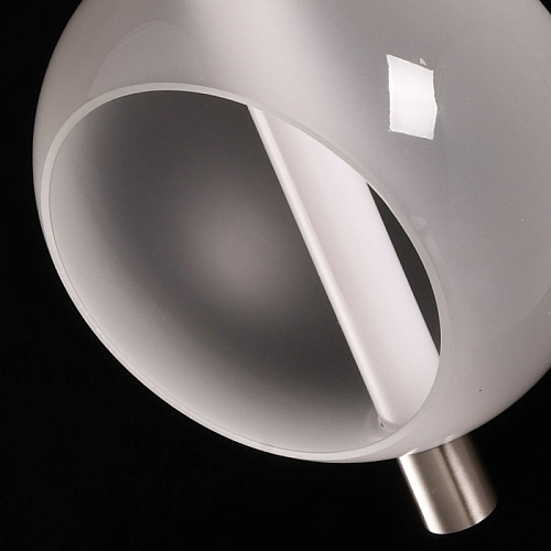 Металлическое основание подвеса гальванизировано в цвет никеля. Светодиодный источник света закрыт акрилом белого цвета. Подвес декорирован оригинальным плафоном из стекла, матированного с внутренней стороны. Декоративный металлический держатель плафона гальванизирован в цвет основания.