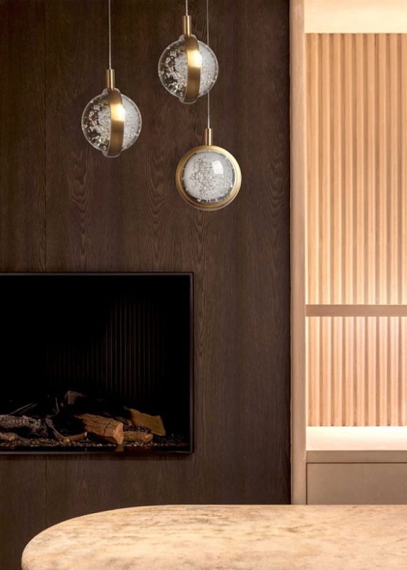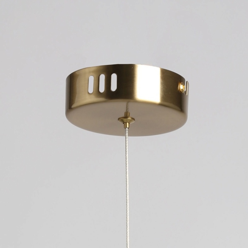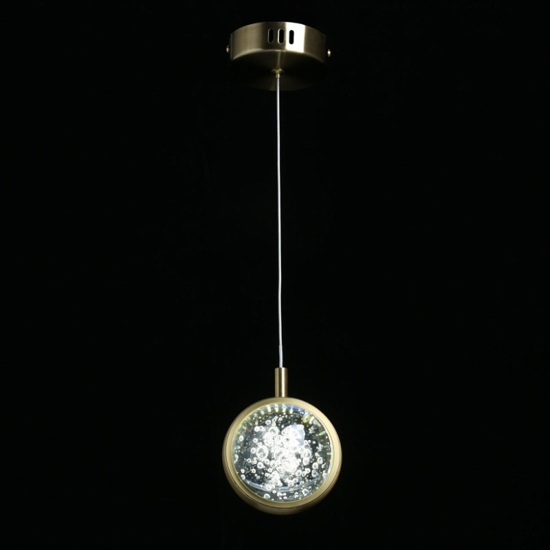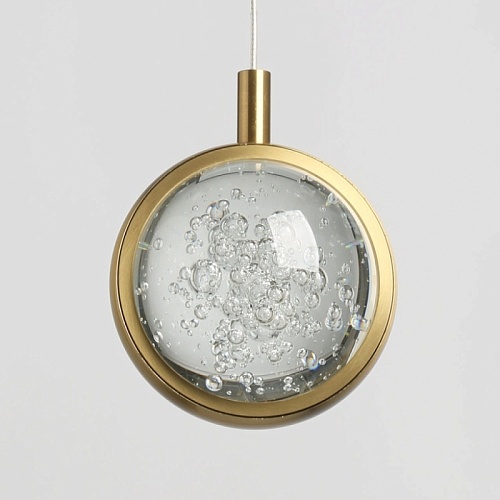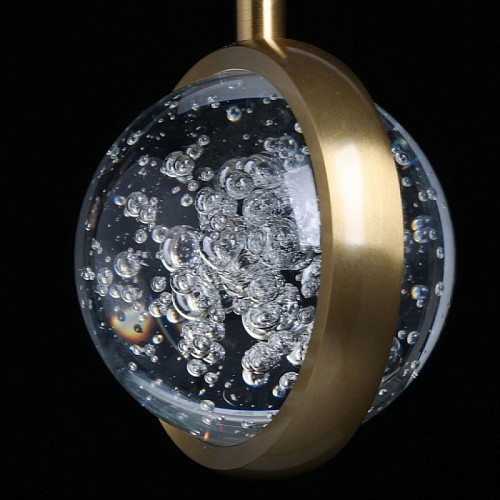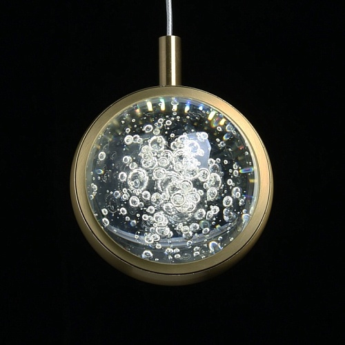 Основание светильника выполнено из сплава алюминия с цинком, обработано по технологии брашинга и гальванизировано в цвет медовой бронзы. Светодиодный источник света закрыт сферой из стекла с включениями пузырьков.
