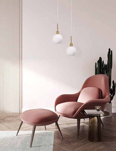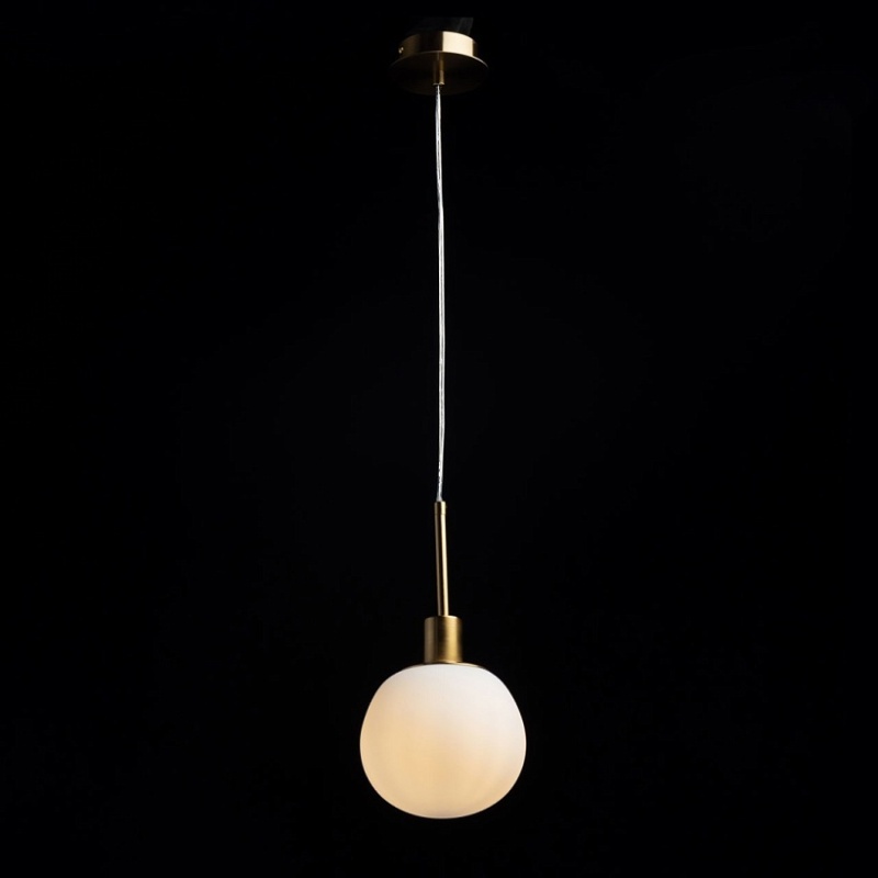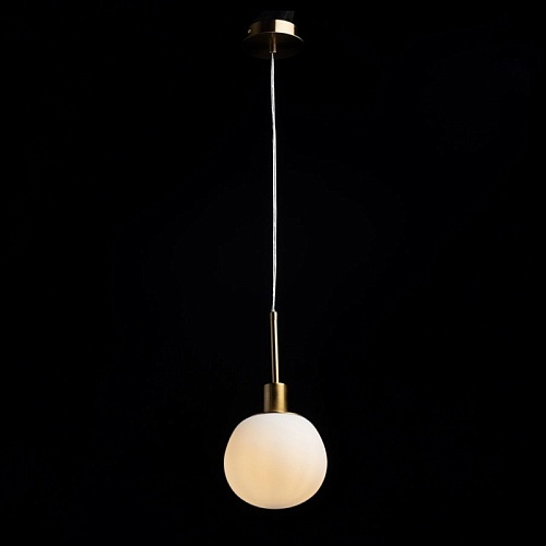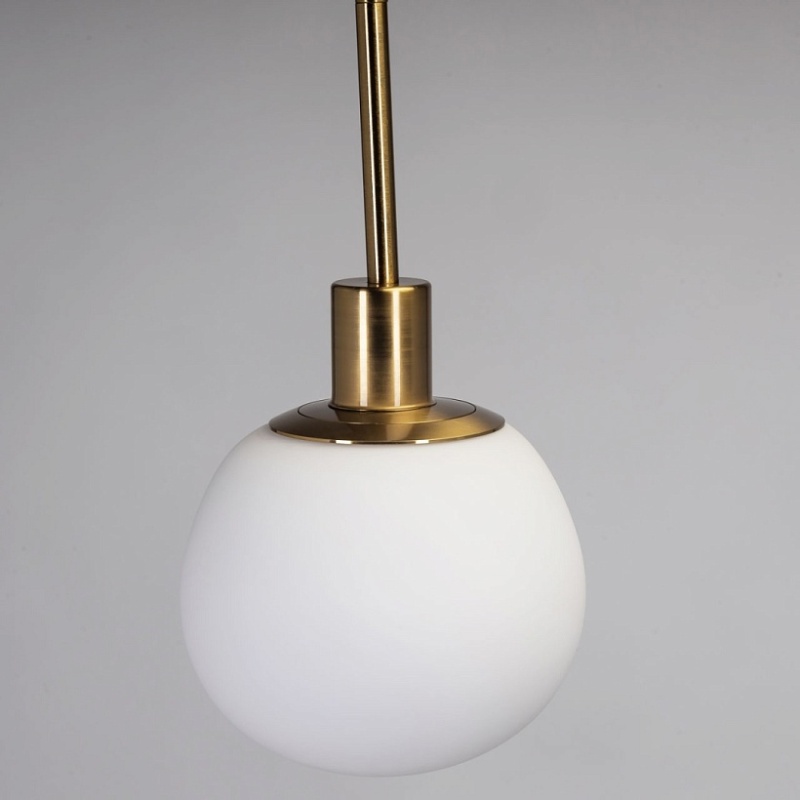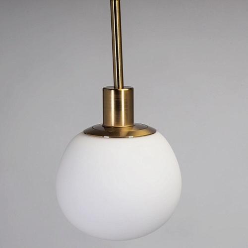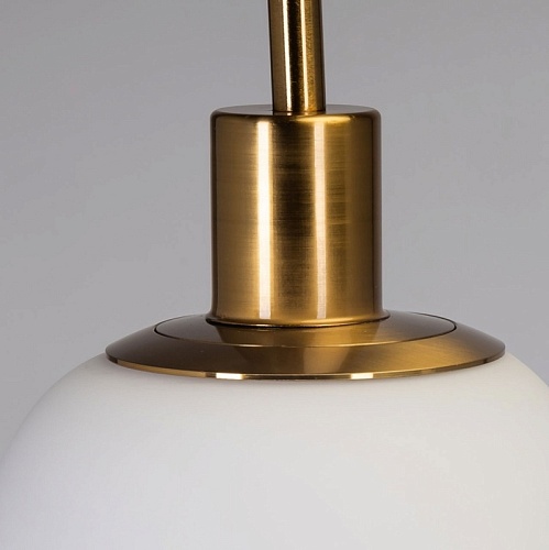 Металлическое основание подвеса гальванизировано в цвет латуни. Подвес декорирован плафоном из белого матового стекла округлой формы.