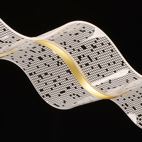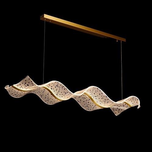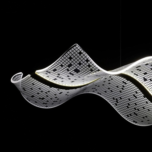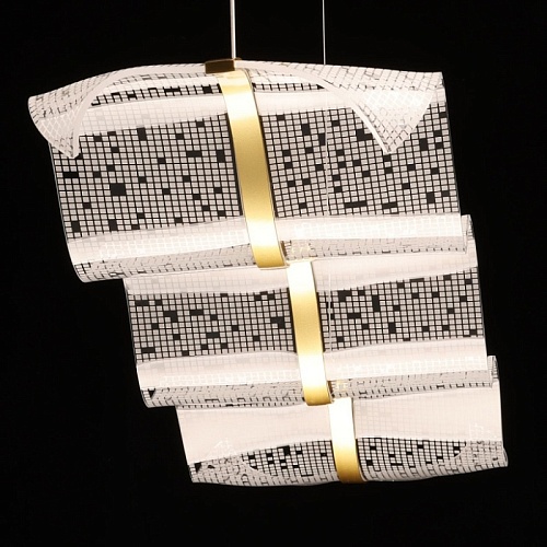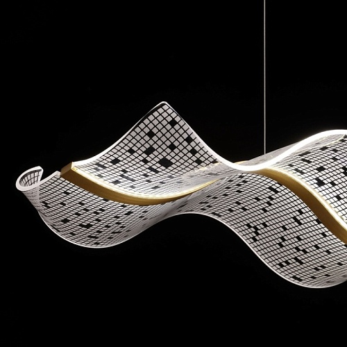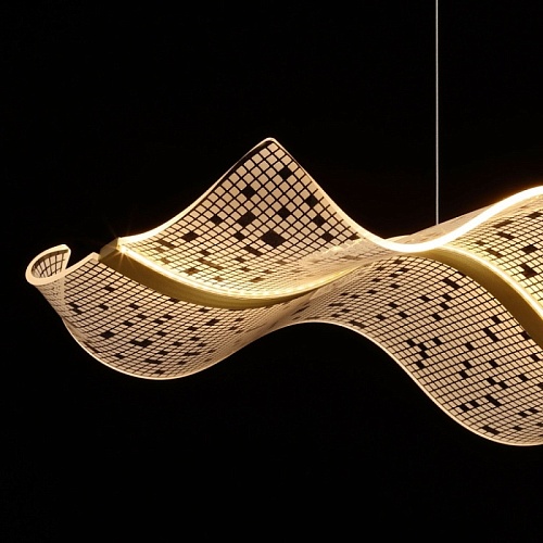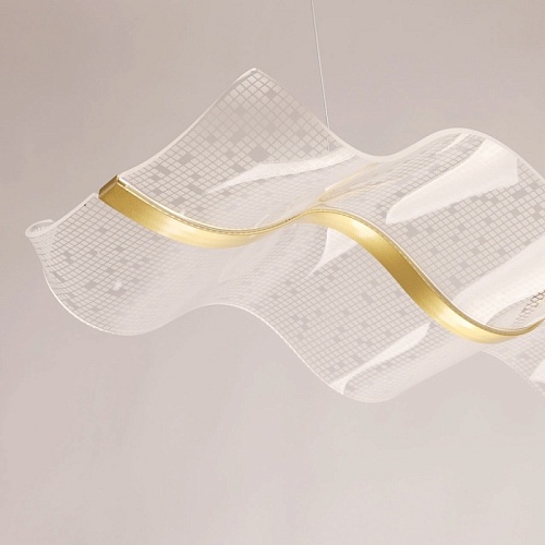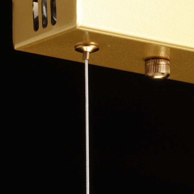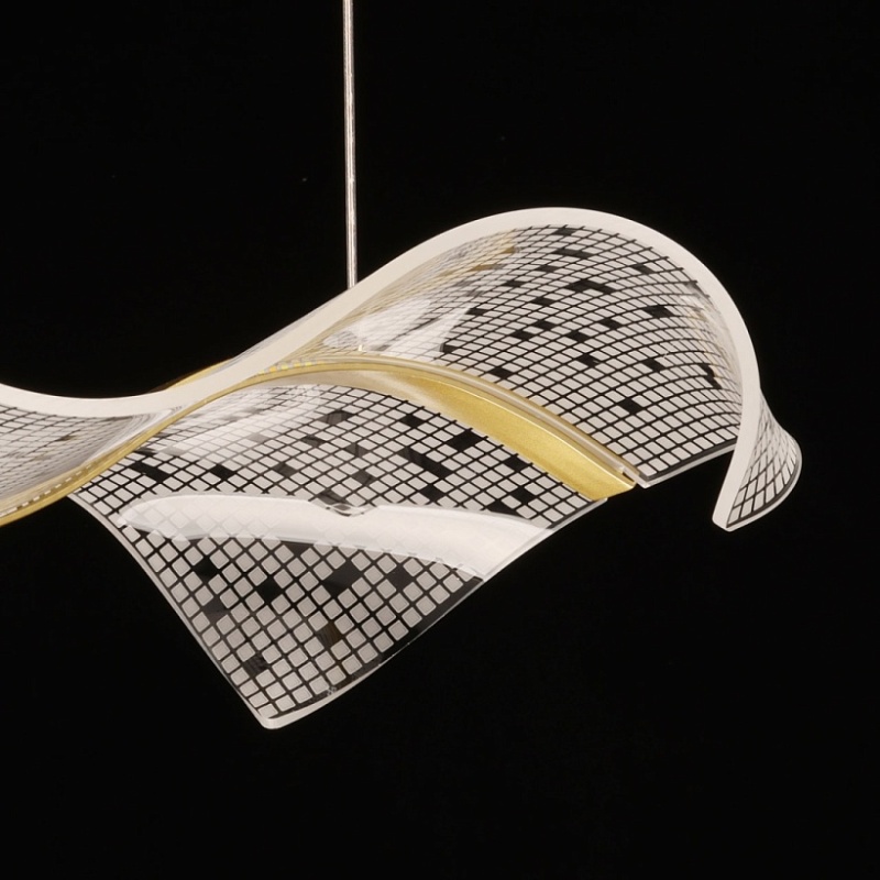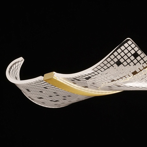 Металлическое основание подвесной люстры гальванизировано в цвет латуни. Корпус плафона выполнен из сплава алюминия с цинком и гальванизирован в цвет основания. Светодиодный источник света закрыт прозрачным акрилом с ячеистым рисунком.