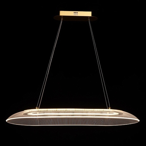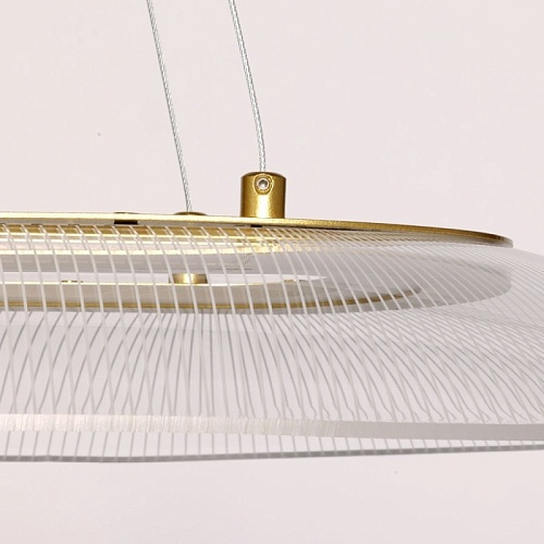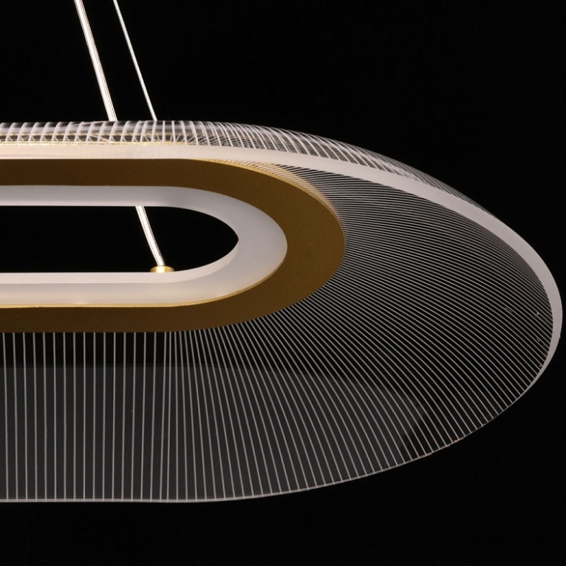 Металлическое основание подвесной люстры гальванизировано в цвет латуни. Корпус плафона выполнен из сплава алюминия с цинком и гальванизирован в цвет основания. Светодиодный источник света закрыт прозрачным акрилом с рисунком.